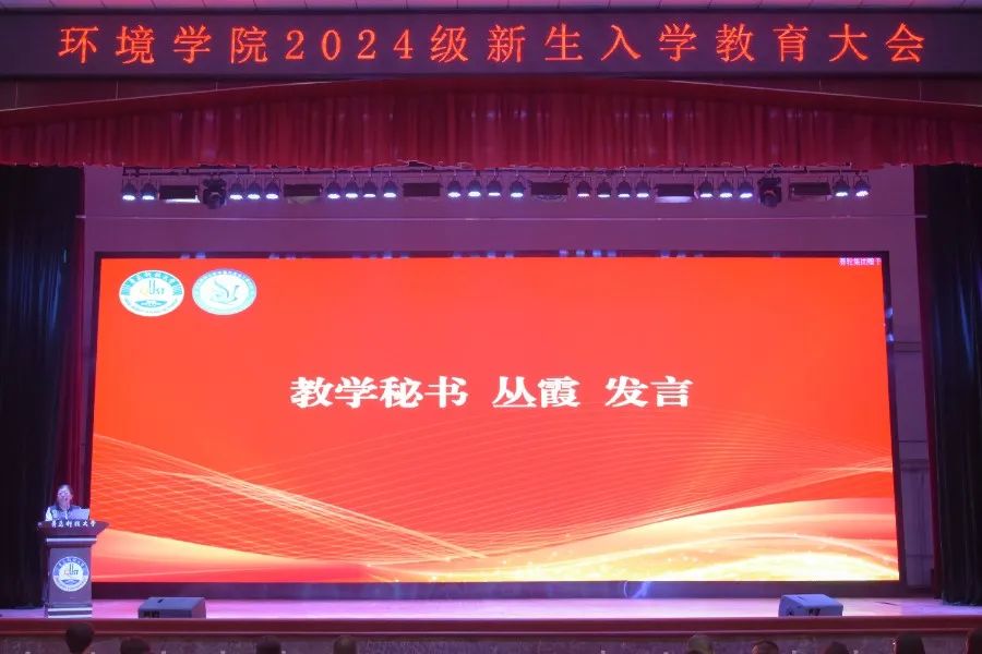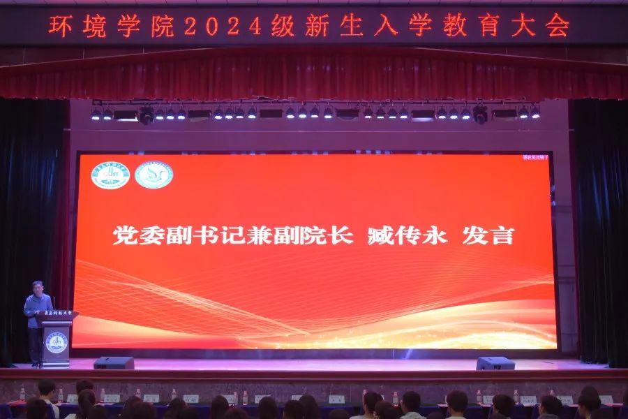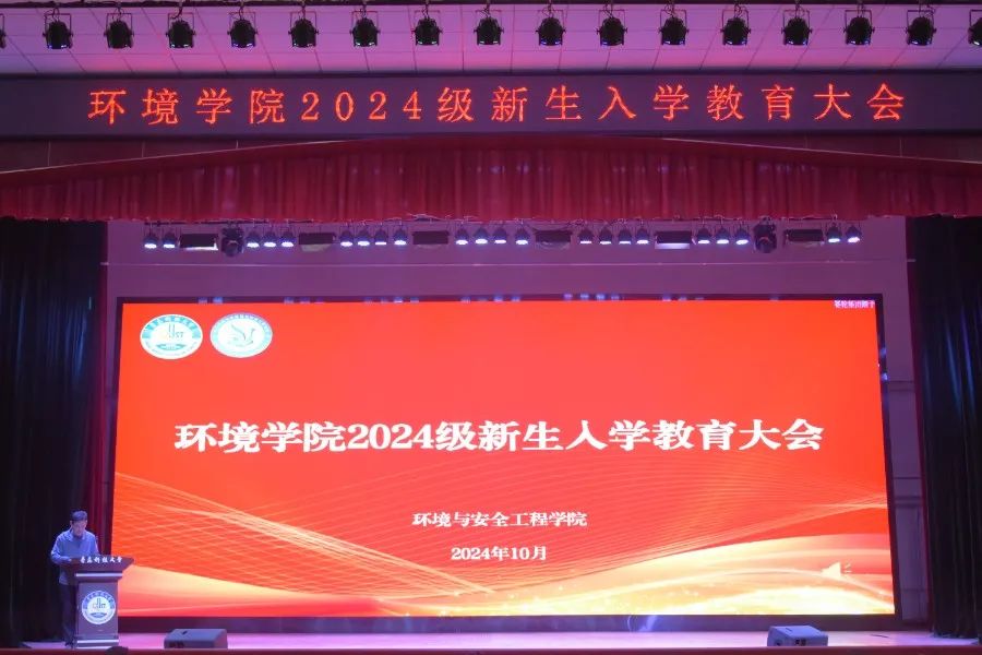 10月15日下午,环境学院2024级新生入学教育大会在四方校区西礼堂举行。学院党委书记王青、院长田文德、党委副书记兼副院长臧传永、副院长程家骥、教师代表贾小平、2024级新生班主任、教学秘书、全体辅导员、在校生代表以及2024级全体学生参加大会,会议由臧传永主持。