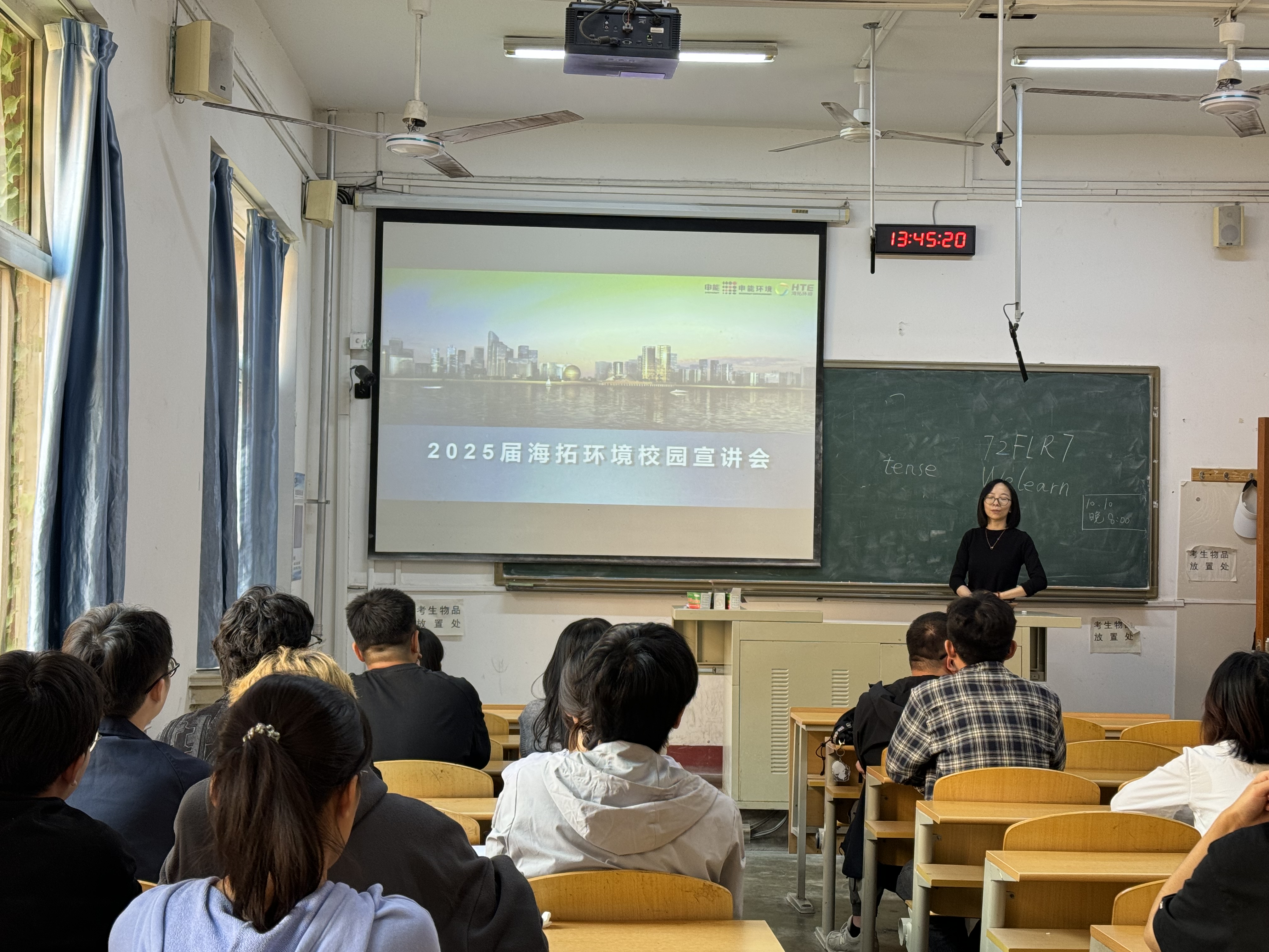为拓宽毕业生就业渠道,进一步促进高质量就业,10月10日,环境学院邀请浙江海拓环境技术有限公司在二教202举办专场招聘宣讲会,环境工程、环境科学和安全工程专业的部分2025届毕业生参加了本次招聘宣讲会。