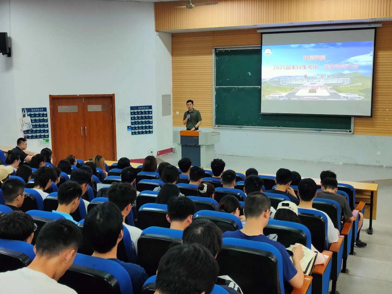 为推动2025届毕业生就业工作开好局、起好步,帮助毕业生进一步认清考研就业形势,合理规划发展道路,提高核心竞争力,7月2日,环境学院在二教101召开2025届本科生考研就业动员会。学院党委副书记兼副院长臧传永、2025届毕业生辅导员张元康及2025届全体本科毕业生参加会议。