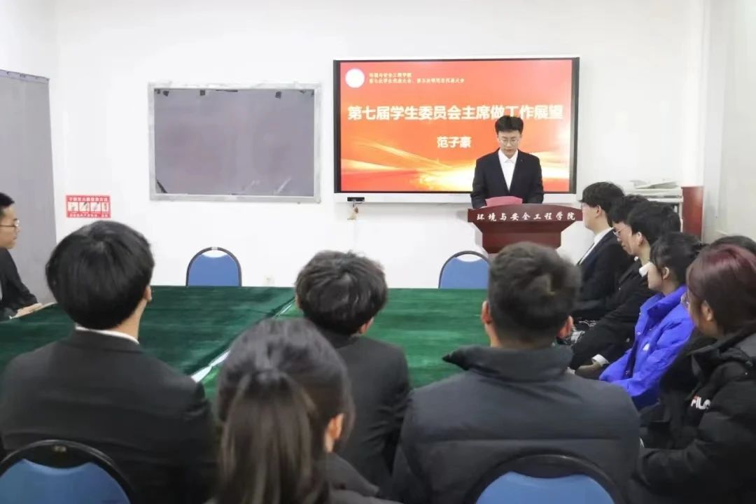 第七届学生委员会成员范子豪对接下来的学生工作做规划展望。他表示会在日常学习生活中加强对学院学生的思想政治教育,重基础、找不足、抓落实,加强学生组织的作风建设,营造浓厚学院文化氛围,丰富学生第二课堂活动,为学院的精神文明建设添砖加瓦。