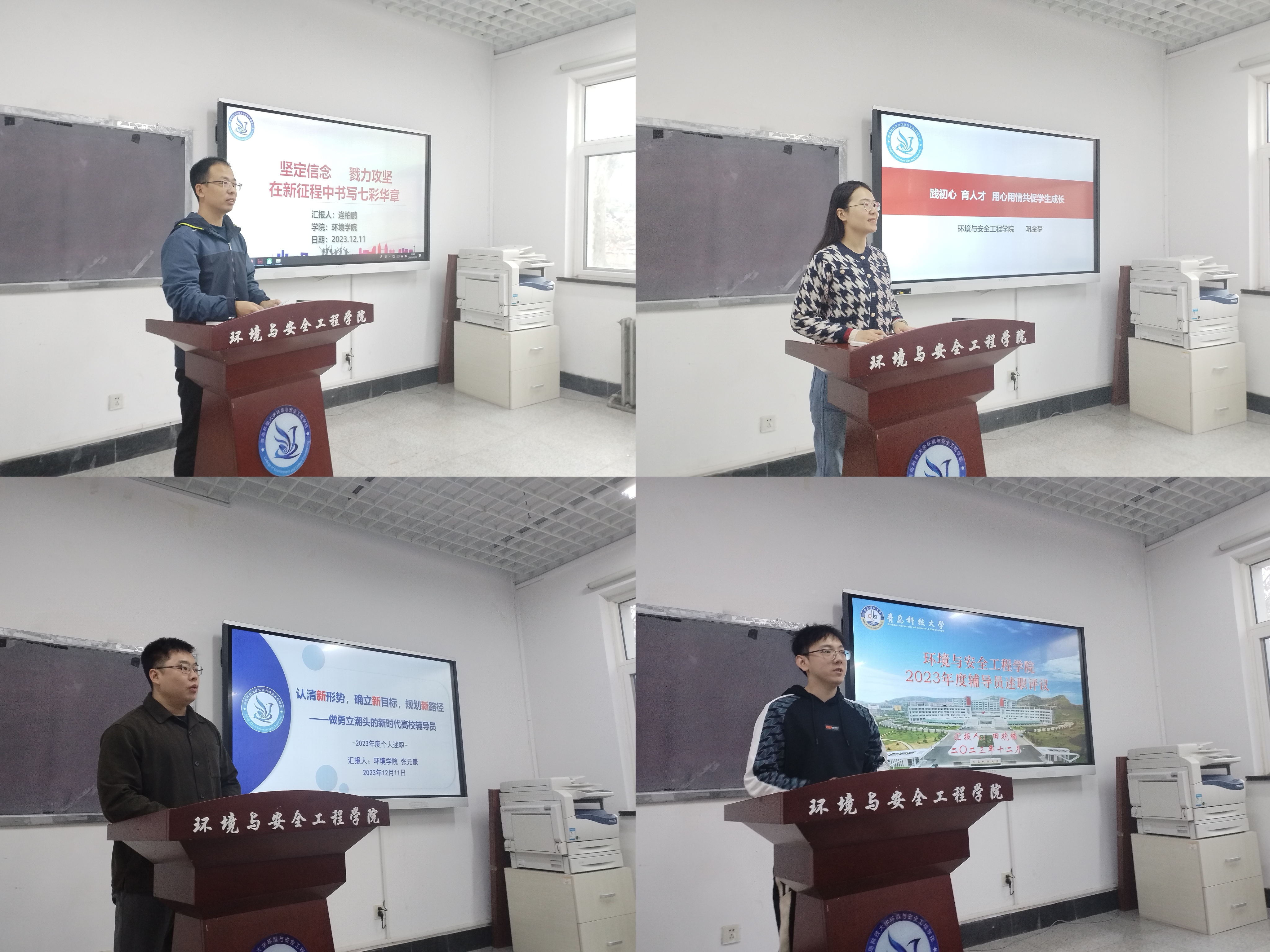会上,逄柏鹏、巩金梦、张元康、田晓楠分别以《坚定信念 戮力攻坚,在新征程中书写七彩华章》《践初心,育人才,用心用情共促学生成长》《认清新形势,确立新目标,规划新路径——做勇立潮头的新时代高校辅导员》《立德树人守初心,培根铸魂育新人》为题进行述职,对2023年度履职情况进行了汇报,对取得的工作成效和存在问题不足进行了分析总结,对下一步改进和提升工作水平做了规划和展望。