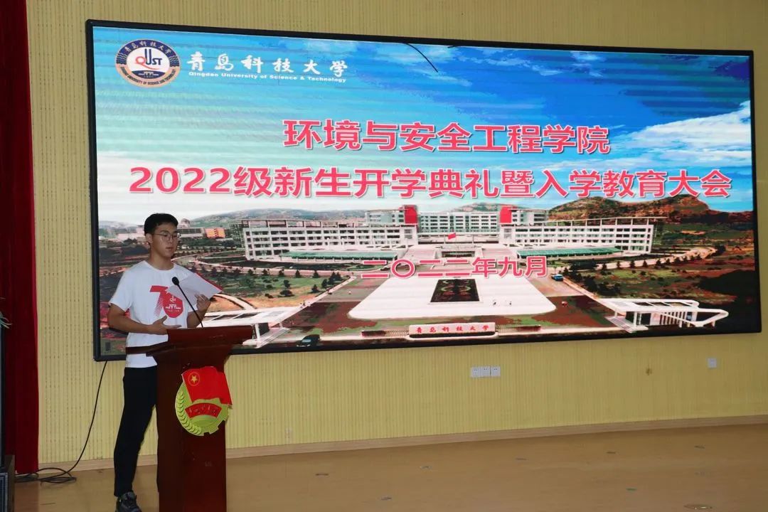 新生代表安全221班学生刘柏辰代表全体2022级同学表明了在即将开启的大学生活中全面规划学习生活、增强集体凝聚力、严格遵守校规校纪的决心和信心。