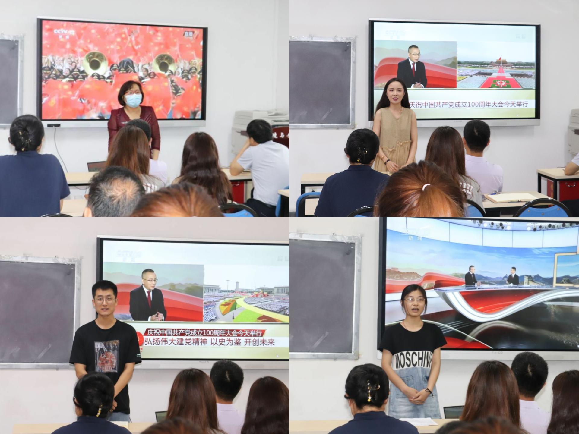 全体党员认真聆听党的领袖习近平总书记重要讲话,感受天安门广场盛大的庆祝氛围,共同为伟大的党庆祝100周年华诞。在收看庆祝大会实况后,与会党员精神振奋、情绪激昂,心情久久不能平静。师生代表进行感悟交流。
