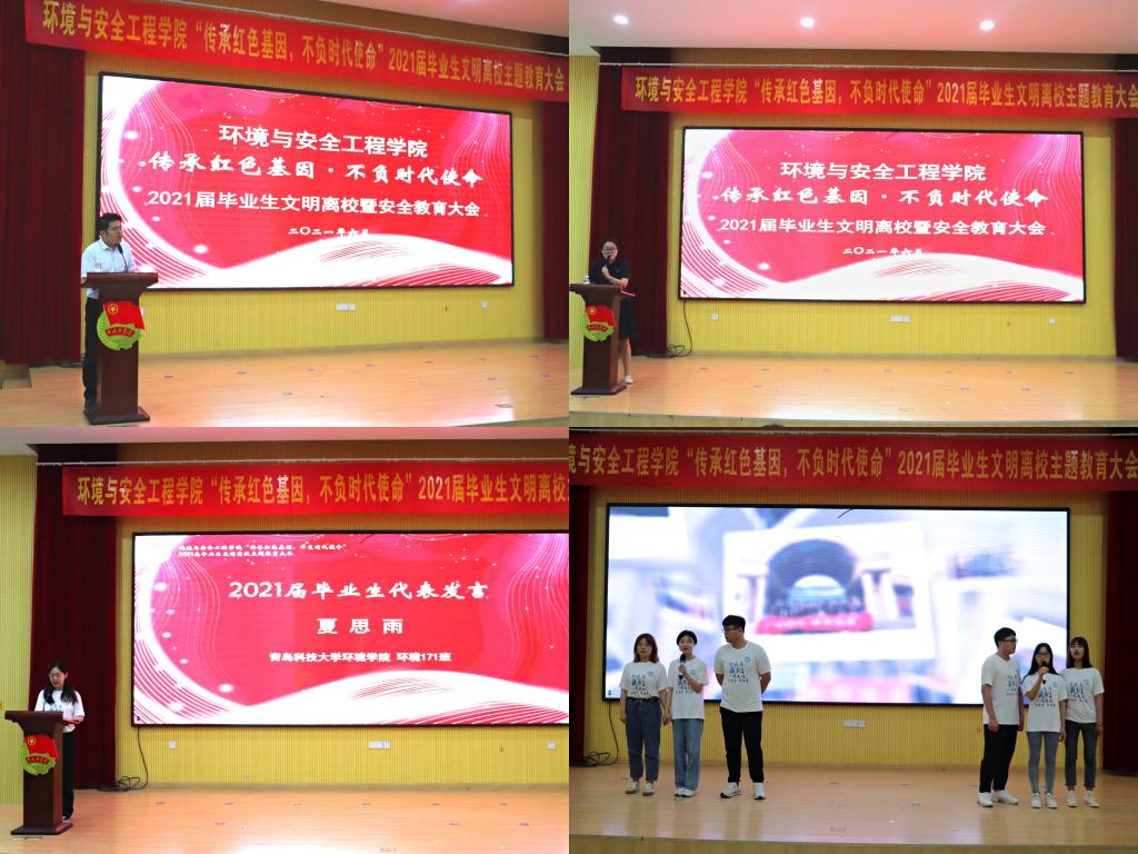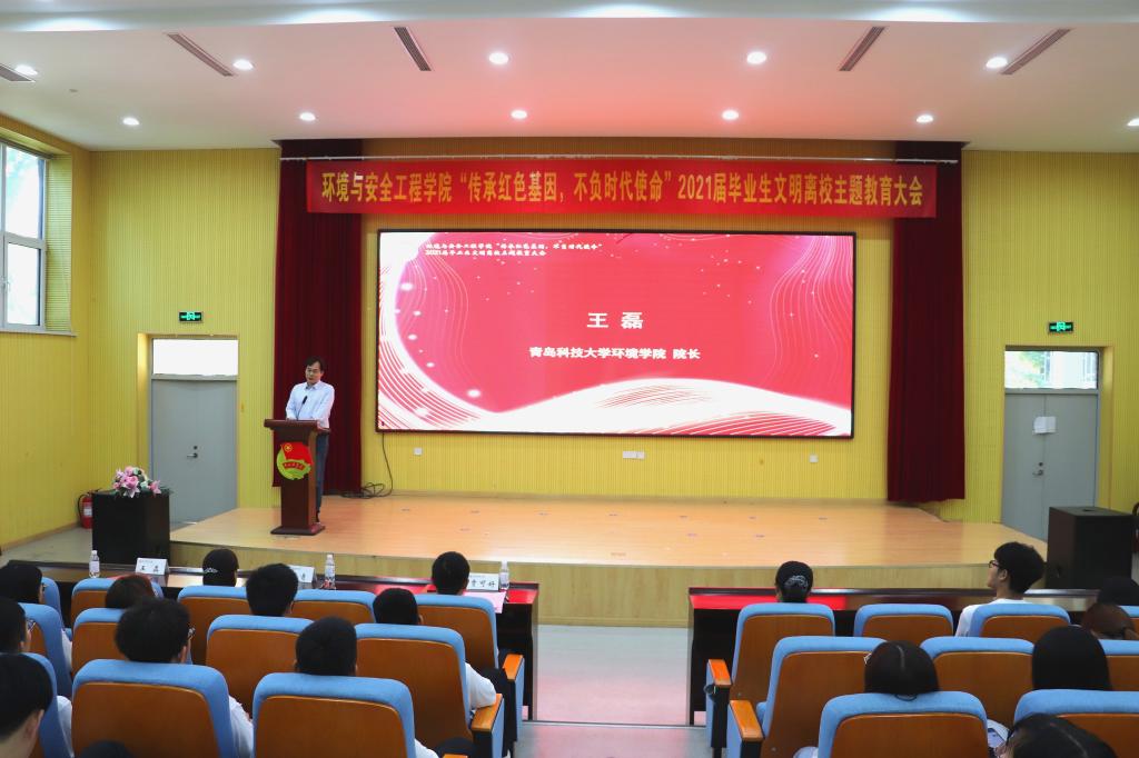 为确保2021届毕业生离校各项工作落地落细落实,做好毕业生离校安全稳定相关工作,6月20日上午,环境学院在尚舜学术报告厅召开“传承红色基因,不负时代使命”2021届毕业生文明离校暨安全教育大会。环境学院党总支书记王青、院长王磊、党总支副书记兼副院长贾可好出席会议,学院学工办(团委)全体老师、230名2021届本科毕业生参加会议。