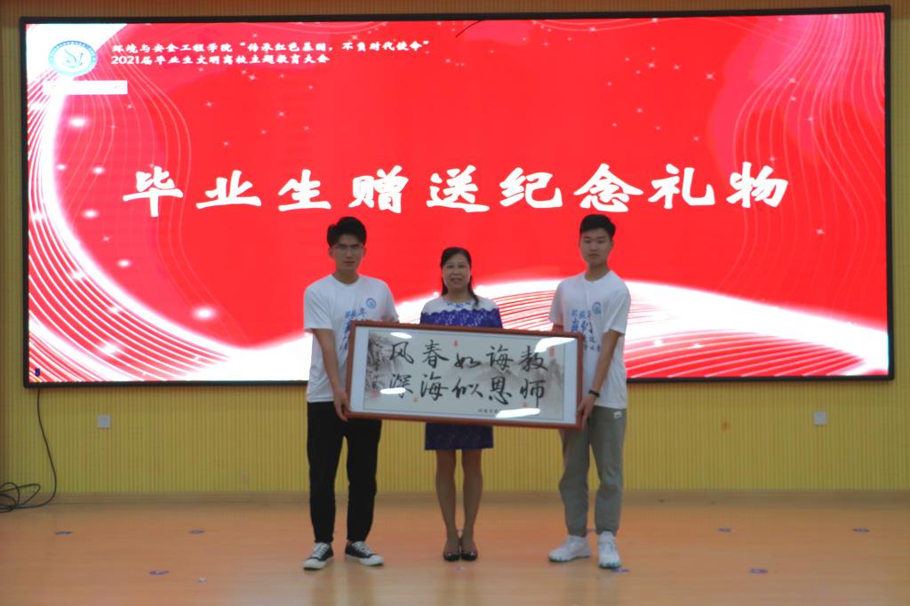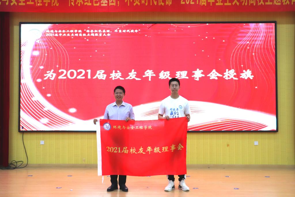 贾可好为学院2021届校友年级理事会授旗,并对毕业生提出四点期待:一是点击“sum”键,全面梳理和总结四年大学生活;二是点击“copy”键,带走在母校取得成功的基因密码;三是点击“delete”键,将所有的负面情绪封印;四是点击“refresh”键,此刻起翻开自己人生崭新篇章。他结合自身体会,寄语毕业生要有独立人格、坚毅品质、奋斗精神、人生智慧、平和心态、健康体魄。