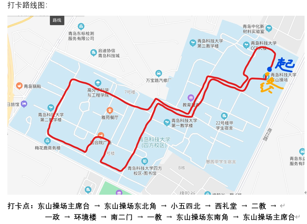 本次打卡路线为:东山操场主席台—东山操场东北角—小五四北—西礼堂—二教—一政—环境学院楼—南二门—一教—东山操场东南角—东山操场主席台。钟硕老师带领同学们以及毕业生代表依次经过红色打卡点和学校代表性建筑。过程中,同学们精神饱满、意气风发、朝气蓬勃,用脚步丈量在青科大的每一寸青春,成为校园里一道靓丽的风景线。