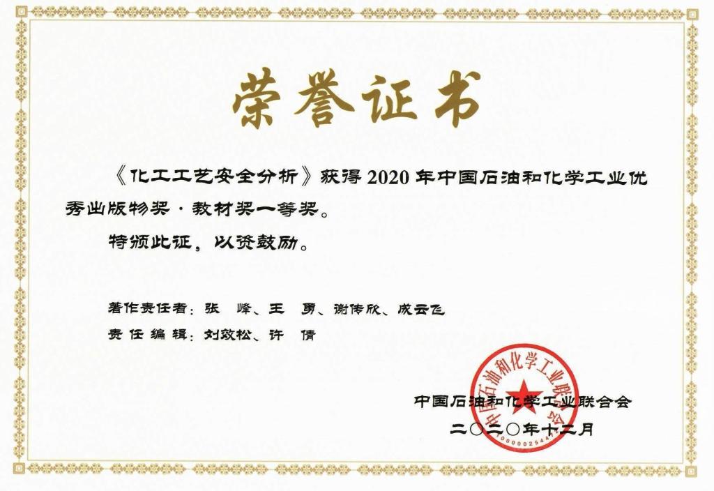 日前,中国石油和化学工业联合会公布了2020年中国石油和化学工业优秀出版物奖(图书奖、教材奖)评选结果,williamhill英国张峰、王勇、谢传欣、成云飞等老师编写的教材《化工工艺安全分析》获优秀出版物奖·教材奖一等奖,该书由中国石化出版社出版。