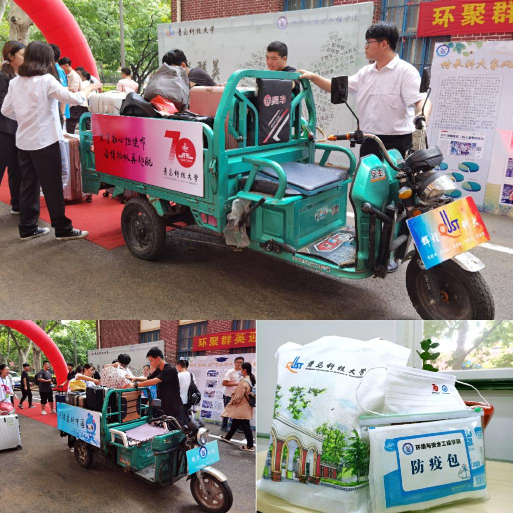 “周到服务”暖人心。考虑新生家长无法进入校园、学生行李较多,学院准备两辆摆渡三轮车,分别取名“辉煌科大”和“魅力环境”,为新生运送行李。两辆摆渡车分别加入了校庆元素和环境特色,车翼上分别印有“砥砺奋进七十载,筑梦科大新时代”、“坚守初心担使命,奋楫扬帆再起航”和“践行‘两山’理念”、“共建美丽中国”的标语。此外,学院还为每一名学生订制了两个印有学校“70周年”校庆logo和学院院徽的防疫口罩和爱心大礼包。