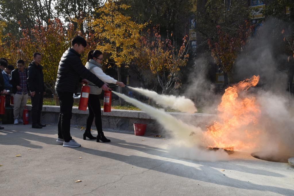 随着演练指令的发出,学院楼师生开始了疏散演练。大家在工作人员的指引下,用湿毛巾捂住口鼻,以楼层为单位,按照规定路线分区域、分方向,弯腰低头快速有序地撤离至小五四广场。演练总共历时3分15秒。随后,保卫处消防科相关老师就灭火器(干粉灭火器和二氧化碳灭火器)的使用原理以及相关注意事项向到场师生做了宣讲,并模拟真实火灾现场,组织师生学习并体验灭火器的使用。