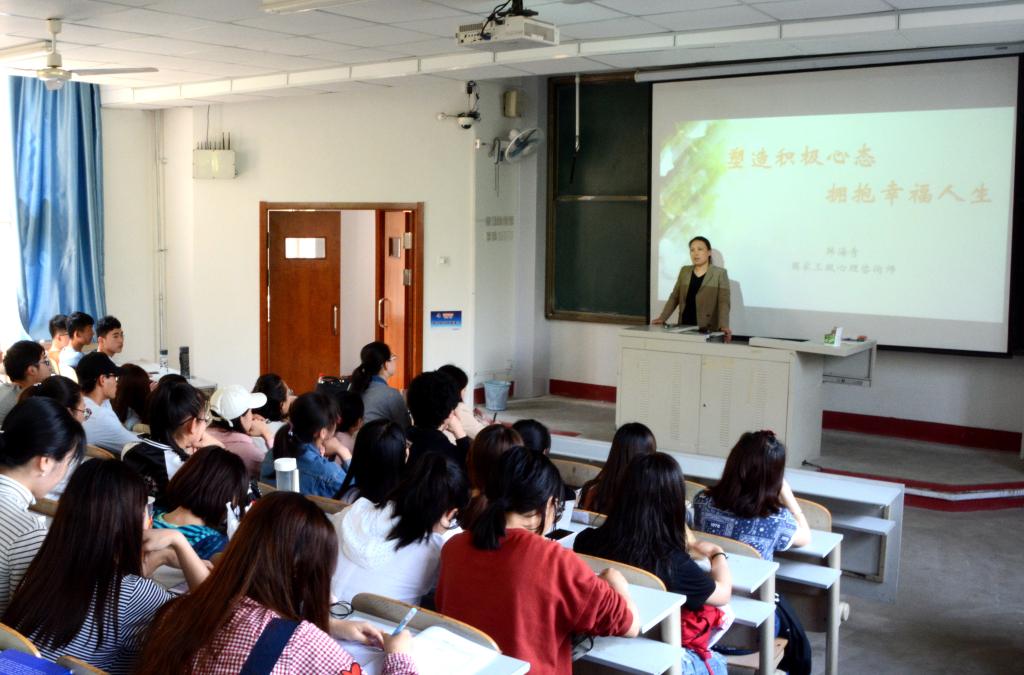 韩海青“塑造积极心态,拥抱幸福人生”的专题讲座。她从积极心理学的含义、背景、基础理论,大学生心理健康教育工作模式转变,如何培养大学生积极心理品质等三个方向,结合理论和实际为同学们详细认真地讲解了积极心理学;并从大学生实际案例出发,结合哈佛大学幸福公开课、尼克胡奇明星事迹等事例,让同学们更加深入了解了“积极心理学”的这一抽象名词。韩海青强调积极心理学的“积极”一词并不单指快乐、幸福,而是让所有人充满活力和毅力的行动。同学们要在日常生活中善于发现自己及他人的优点,以积极的方式考虑问题。最后,韩海青为同学们总结出“感恩拜访”、“三件好事”、“全力以赴”、“运用优势”四种典型方法,希望同学们能在这些方法的帮助下拥有更加幸福快乐的大学生活。环境学院心理工作站站长、学工办副主任王媛与同学们就大学生恋爱观等话题进行了互动交流,并与大家分享了学院“幸福之约”2017年暑期社会实践服务队关于大学生婚恋观的调研情况,为同学们解答了疑惑。