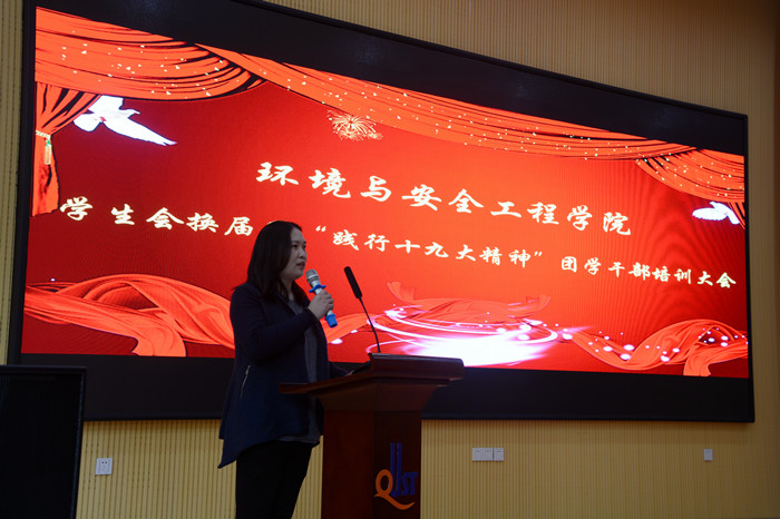 为庆祝党的十九大胜利召开,引导广大青年团学干部不忘初心、牢记使命,以奋发向上的精神贯彻落实践行十九大精神,更好地推动学院学生工作的顺利开展,10月24日下午,环境学院举行新一届学生会换届暨“践行十九大精神”团学干部培训大会。环境学院党总支副书记兼副院长韩海青出席会议并讲话。环境学院分团委全体教师以及学院第十一届、第十二届学生会主要成员参加了会议,四方校区学生会及各兄弟学院学生会主席团成员也应邀参加大会。