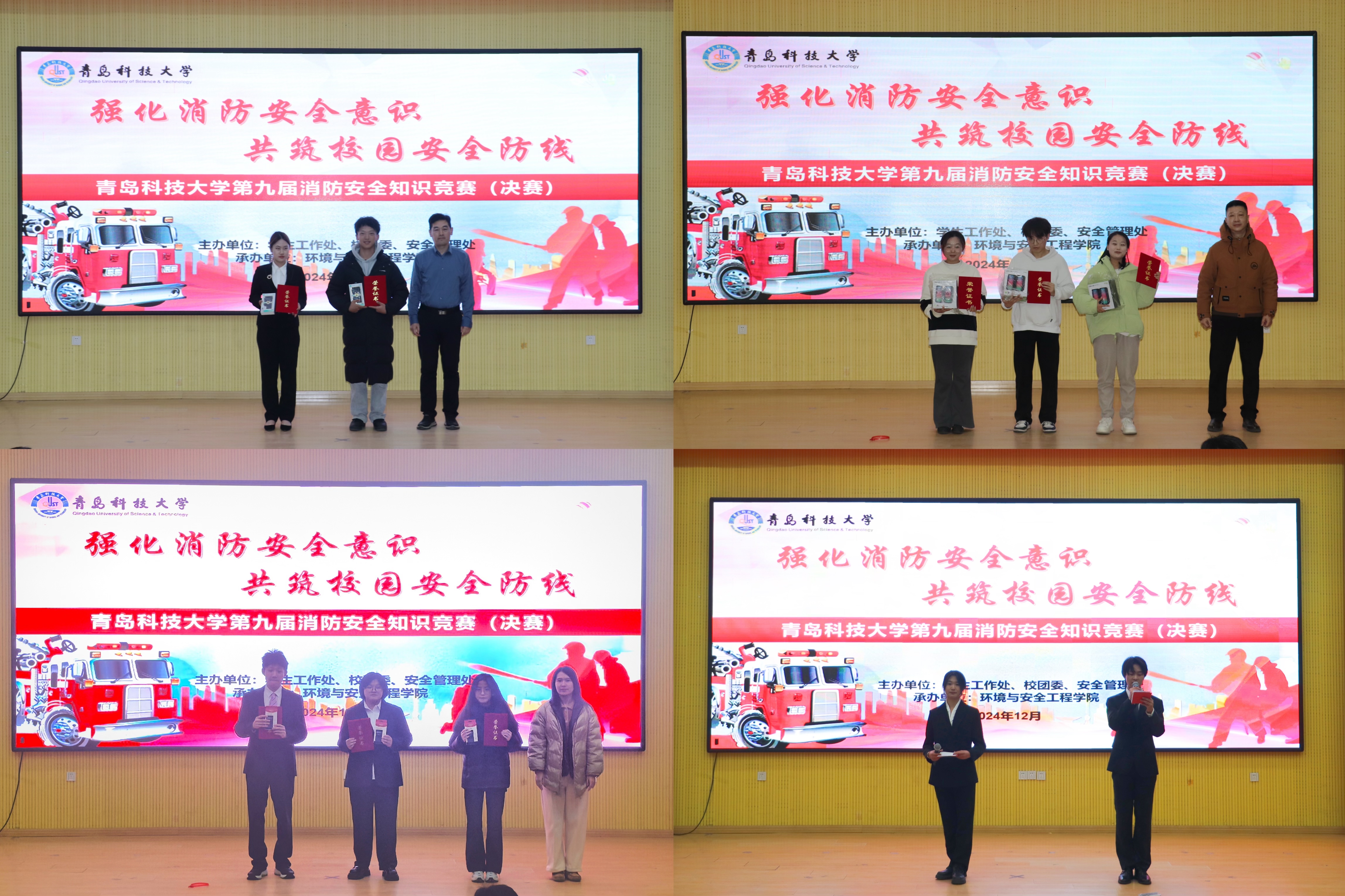 为增强大学生消防安全意识,推动构建安全谐校园,12月12日晚,由学生工作处、校团委、安全管理处主办,williamhill英国承办的“强化消防安全意识,共筑校园安全防线”第九届大学生消防安全知识竞赛决赛圆满结束。环境学院党委副书记兼副院长臧传永、安全管理处四方校区消防科仇立峰、环境学院团委副书记兼学工办副主任巩金梦、生物工程学院团委副书记兼学工办副主任刘金岭以及相关学院辅导员及师生代表参加活动。
