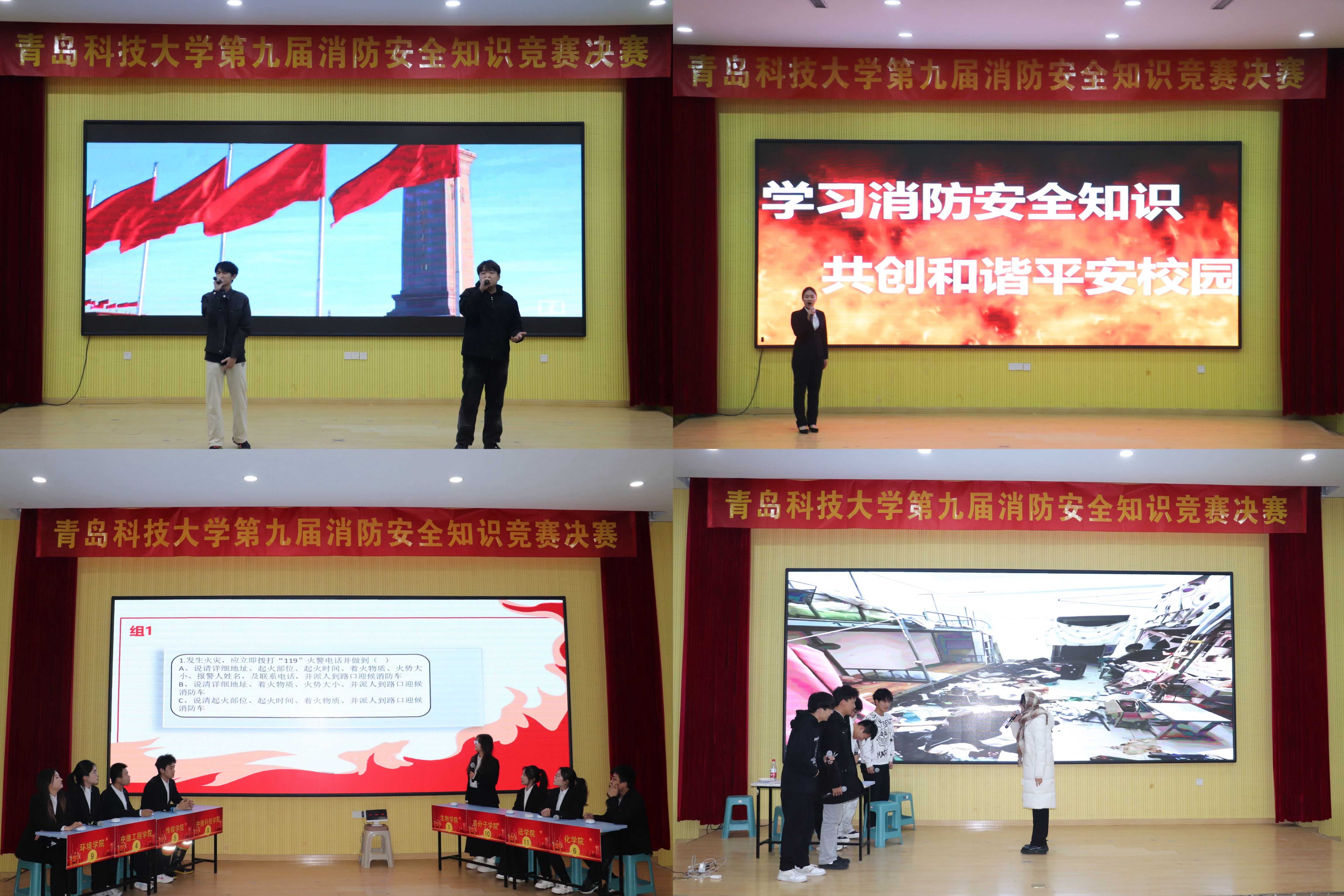 比赛以歌曲《无名之辈》拉开序幕,借歌声表达对消防英雄的深深敬意。决赛分为主题演讲、知识问答和情景模拟三个环节。在主题演讲环节,参赛选手紧扣“强化消防安全意识,共筑校园安全防线”主题,结合自身经历与感悟,阐述对消防安全的见解,彰显当代学子对维护校园安全的使命感。在知识问答环节,选手们凭借牢固的消防安全知识基础与敏捷的反应能力,迅速准确作答,现场气氛紧张而热烈,展现了学生们对消防安全知识的深入掌握。在情景模拟环节,选手们通过逼真的表演,将宿舍、教师、实验室等场景搬上舞台,生动再现了各种火灾场景中的应急处置流程,引导学生强化消防安全意识,共筑校园安全防线,赢得了在场观众的热烈掌声。