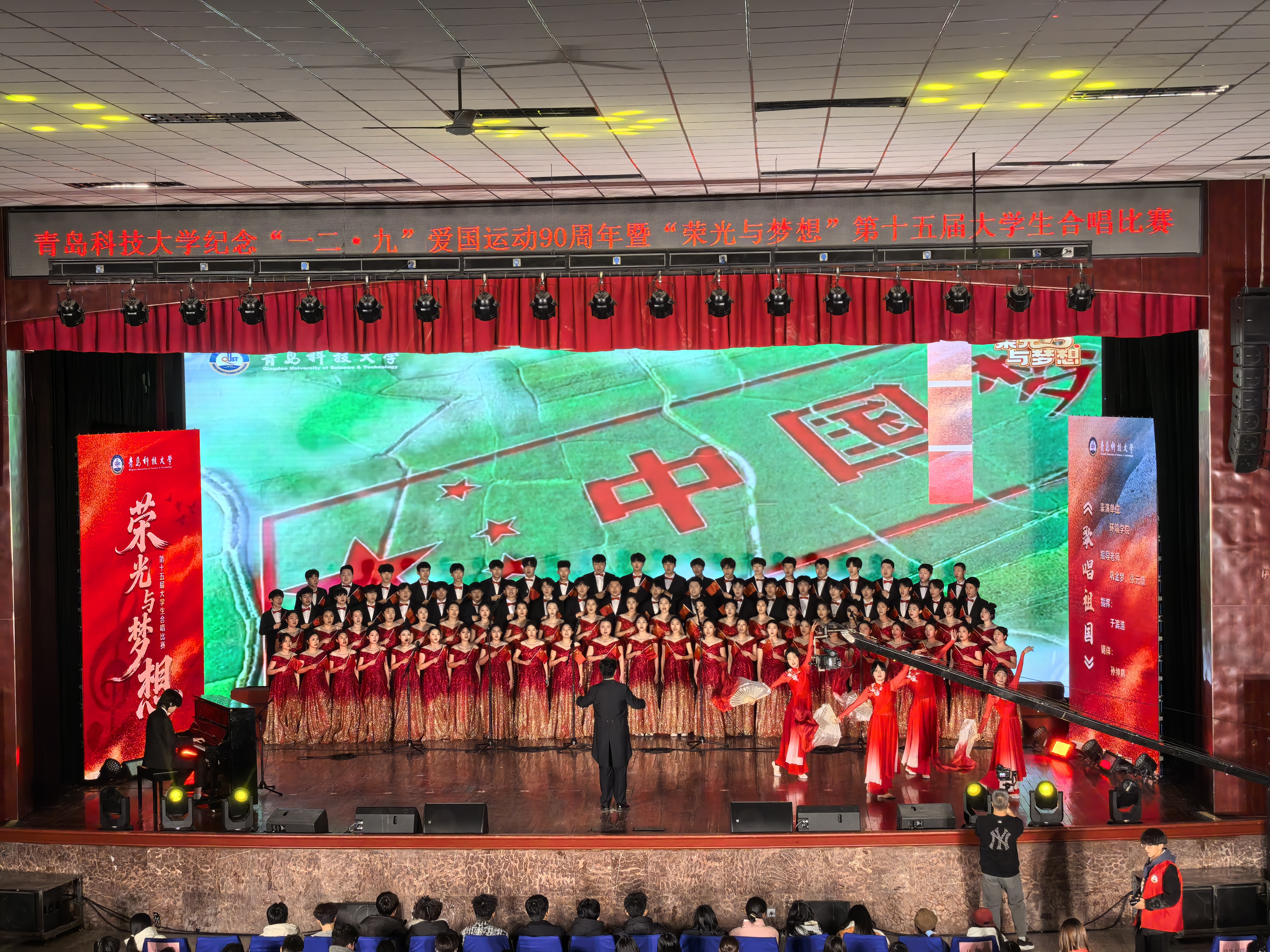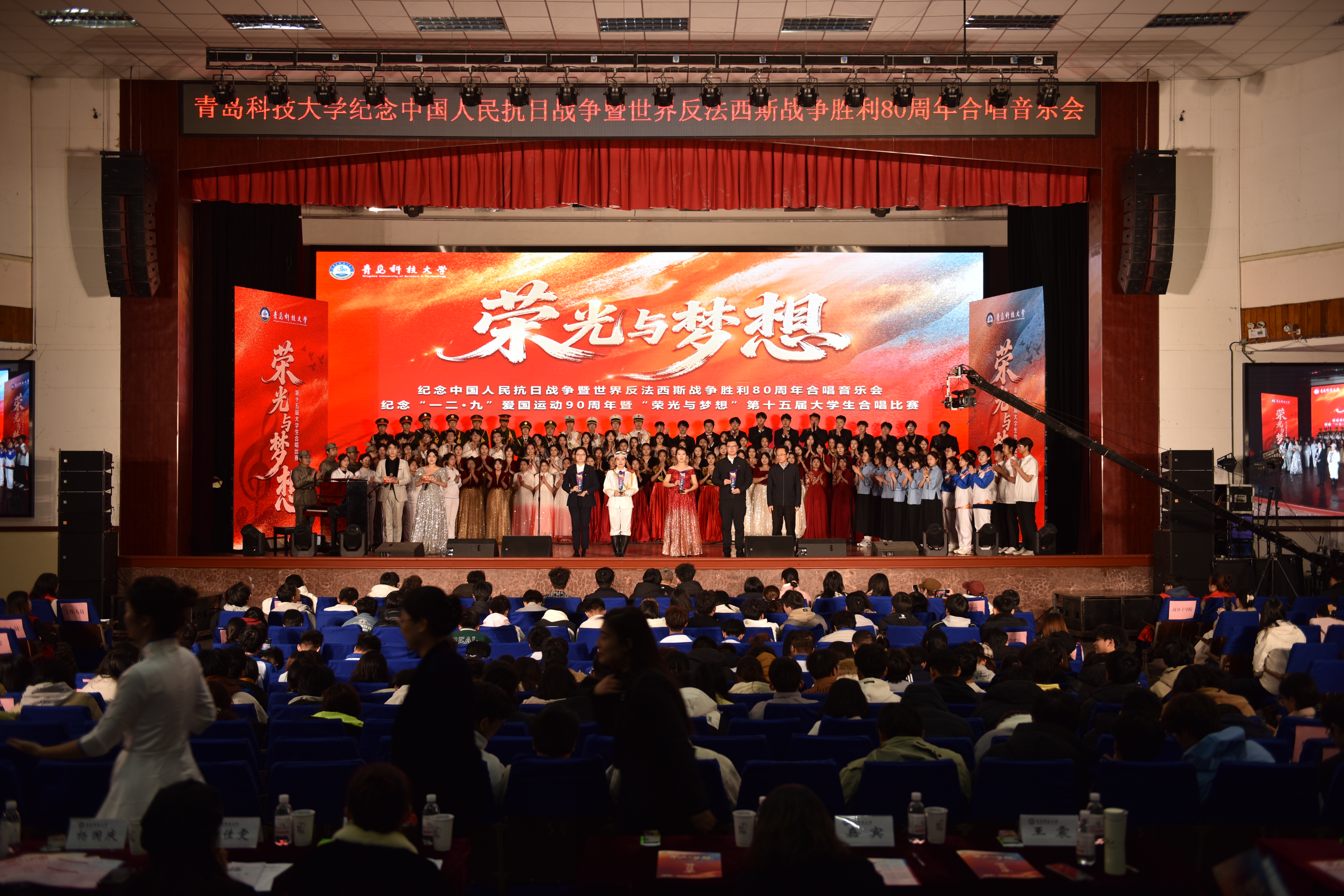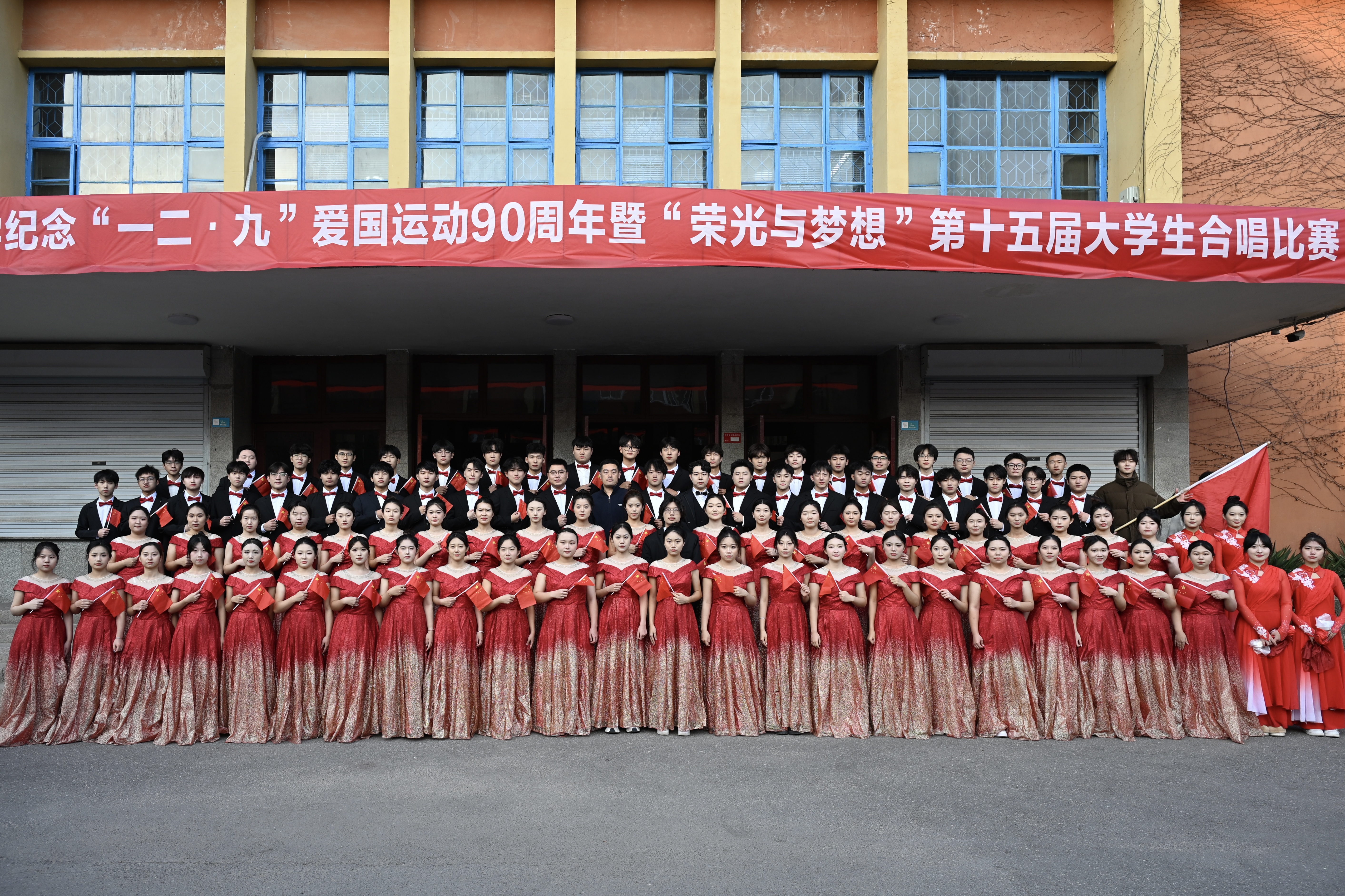 为传承红色基因,弘扬爱国精神,12月9日下午,“纪念中国人民抗日战争暨世界反法西斯战争胜利80周年合唱音乐会、纪念‘一二·九’爱国运动90周年暨‘荣光与梦想’第十五届大学生合唱比赛”决赛在四方校区西礼堂隆重举行。