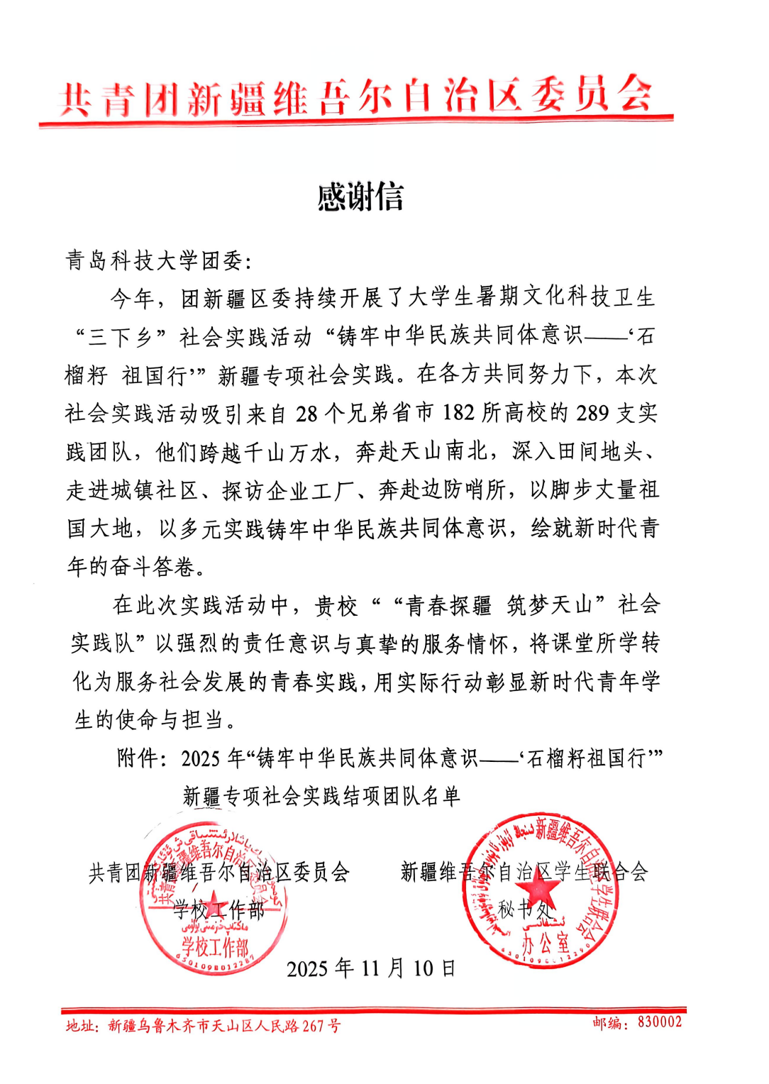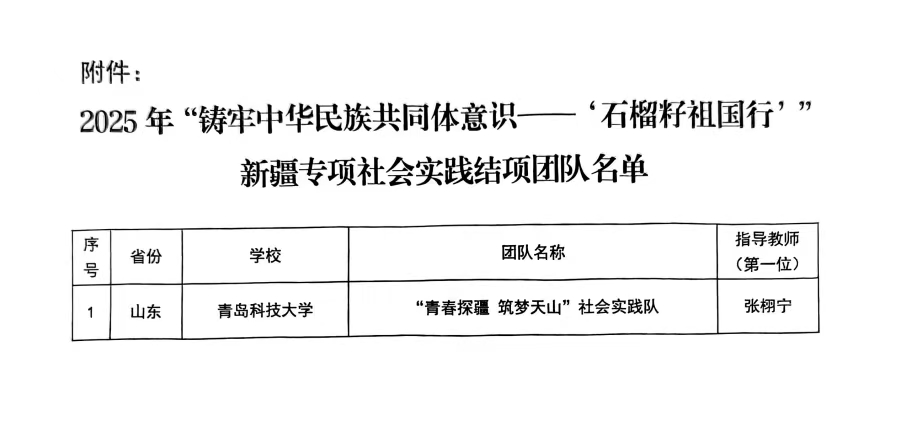 近日,环境学院团委收到来自团新疆区委学校工作部、新疆学联发来的感谢信,对我院“青春探疆 筑梦天山”社会实践队在2025年全国大学生暑期文化科技卫生“三下乡”社会实践活动“铸牢中华民族共同体意识——‘石榴籽 祖国行’”新疆专项社会实践活动的出色表现予以高度表扬和感谢。