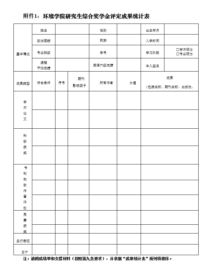 附件1:《环境学院研究生综合奖学金评定成果统计表》