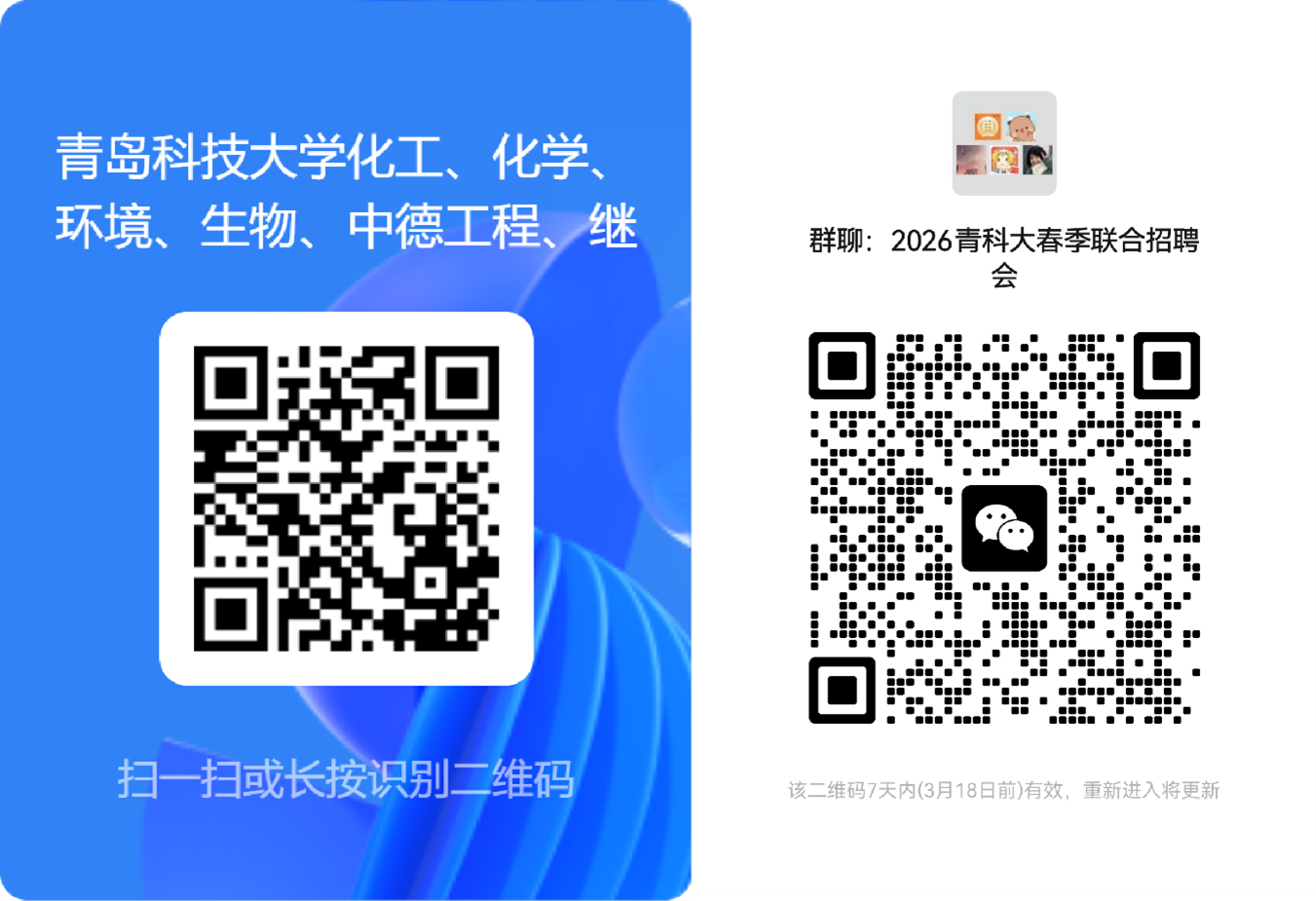 1.企业招聘信息登记。有意向参加本次网上招聘会的单位,于3月31日18:00之前通过扫描下方左侧二维码进行报名,并加入右侧招聘信息微信群,请准确填写相关内容。