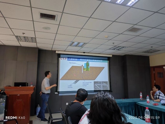 刘国博士在报告中详细介绍了直流和交流杂散电流对油气管道的干扰类型、检测及缓解方法。此次报告中,大量的工程案例对现场师生启发意义重大,报告结束后,刘国博士和参会师生就各种干扰类型对油气管道的干扰程度及缓解措施等方面进行了深入的交流。