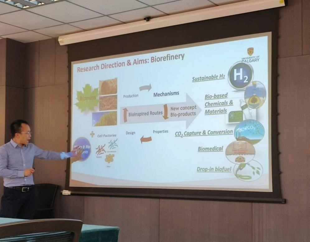 胡劲光博士的报告围绕“将生物质转化为生化物质和绿色氢”等方面展开,讲解了如何利用太阳能分解生物质(小麦秸秆)来制造绿色氢和高价值的生物化学物质,从而节省大量碳和成本。师生对生物质相关问题和胡博士展开热烈探讨。