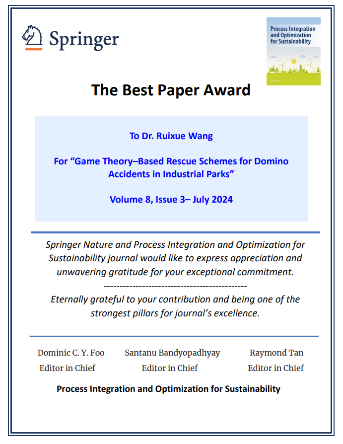 近日,贾小平教授课题组研究生王瑞雪在国际期刊Process Integration and Optimization for Sustainability (PIOS)发表的论文《Game Theory–Based Rescue Schemes for Domino Accidents in Industrial Parks》荣获2024年度最佳论文奖。该奖项自PIOS 2017年创刊时发起。本次评奖是从2024年所发表的论文中评选出两篇作为年度最佳论文。