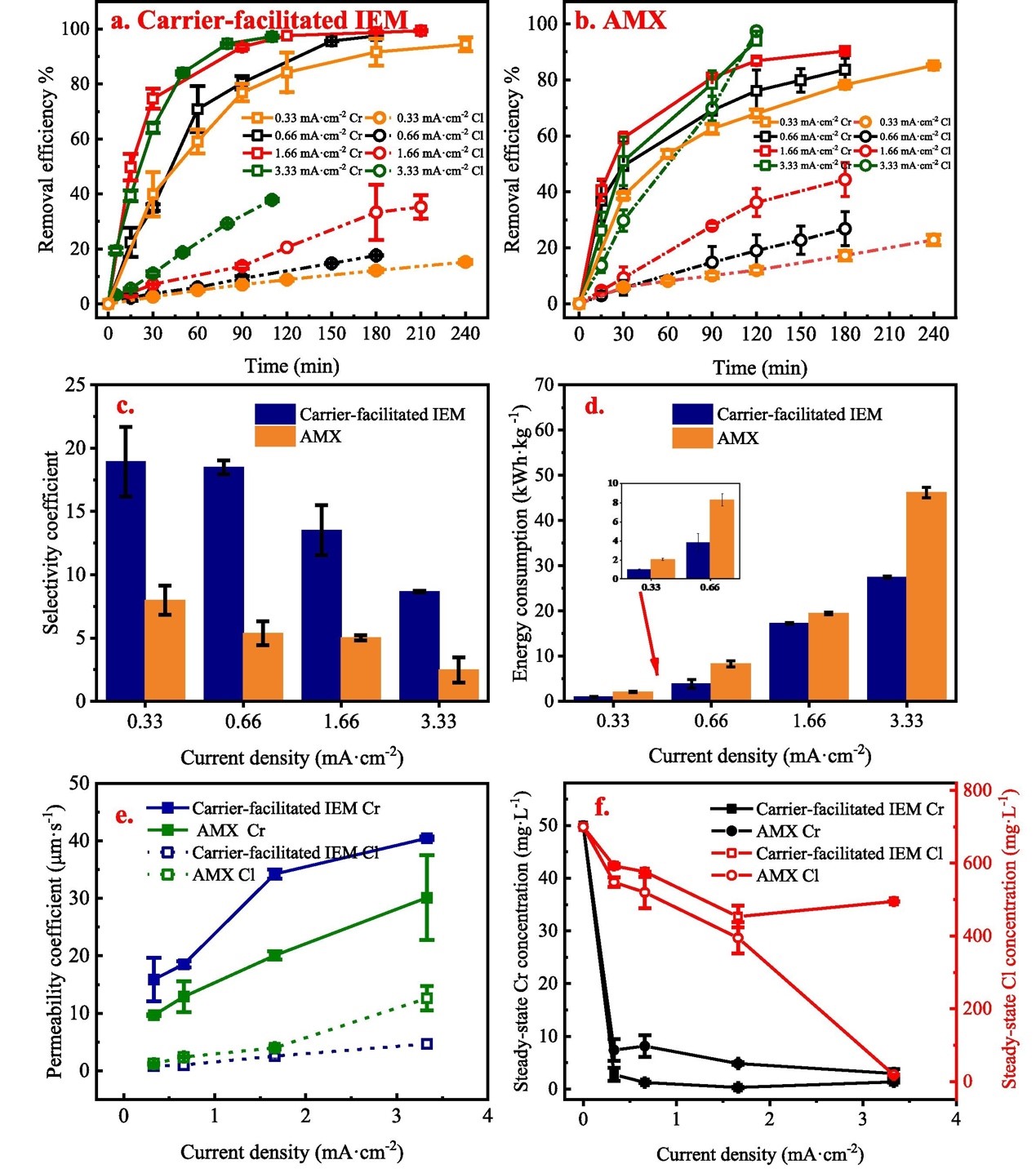 研究发现载体促进离子交换膜对Cr(VI)的选择性优于Cl-,当Cr(VI)浓度为50 mgL-1, Cl-浓度为700 mg·L-1,电流密度为0.66 mA·cm-2时,选择性系数为20.6。我们观察到渗透系数高达40.4µms-1,显著超过了通常与固定位点跳跃相关的渗透系数,表明我们的载体促进膜中连续通路机制的主要运作。电流密度的增加与这些离子的传输速率呈正相关,载体促进IEMs有助于在所有检测密度下完全去除Cr(VI),并且选择性系数显著提高。较小的电流密度对FCDI与载体促进IEM系统相结合是有利的,因为它有较低的能量需求和较高的选择性系数。在不同浓度下,Cr(VI)的去除率保持较高且稳定,而Cl-的去除率下降,表明存在有利于Cr(VI)去除的竞争相互作用。这种竞争导致了分离系数的提高和能量需求的变化,突出了系统对不同Cr(VI)浓度的适应性,以及Cl-浓度对分离动力学和过程能量效率的显著影响。该研究强调了单通道和双通道FCDI配置在水净化技术中显著节能和操作优势的潜力,挑战了传统的ED方法。