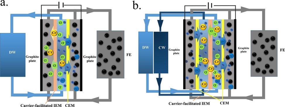 相关研究成果以“Selective removal of chromium and chloride by flow electrode capacitive deionization (FCDI) with carrier-facilitated ion exchange membrane”为题发表在一区TOP期刊Chemical Engineering Journal(IF = 13.3)上。团队谭明教授为论文第一作者,刘飞副教授为通讯作者,英国威廉集团为第一作者和通讯作者单位。