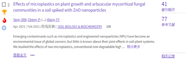 (2)论文2发表于土壤类top期刊《Soil Biology and Biochemistry》(https://doi.org/10.1016/j.soilbio.2021.108179),累计被引41次,该论文也同时入选高被引论文。该文报道了传统难降解微塑料高密度聚乙烯(HDPE)、可生物降解微塑料聚乳酸(PLA)和纳米氧化锌对植物生长及锌积累的效应,并评估了它们对丛枝菌根真菌群落结构的影响,为认识微塑料和纳米颗粒的生态风险提供参考。