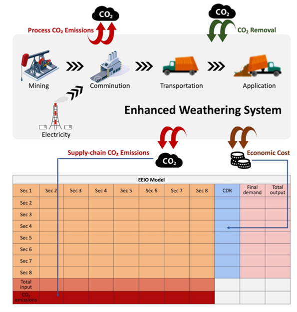 增强岩石风化是一种具有潜力的负排放技术,通过将大气中的二氧化碳固定为碳酸氢盐或碳酸盐,从而实现碳汇效应。但该技术在能源密集型经济体中大规模应用的可持续性尚未明确。该研究聚焦玄武岩强化风化的国家尺度大规模部署情景,构建了新型环境扩展投入产出模型,科学估算不同减排路径下的部署规模需求,并系统评估了其产生的直接与间接经济、环境影响。研究明确了玄武岩增强风化技术部署可行性高度依赖于脱碳电力供应、物流系统优化和颗粒粒径精准控制。