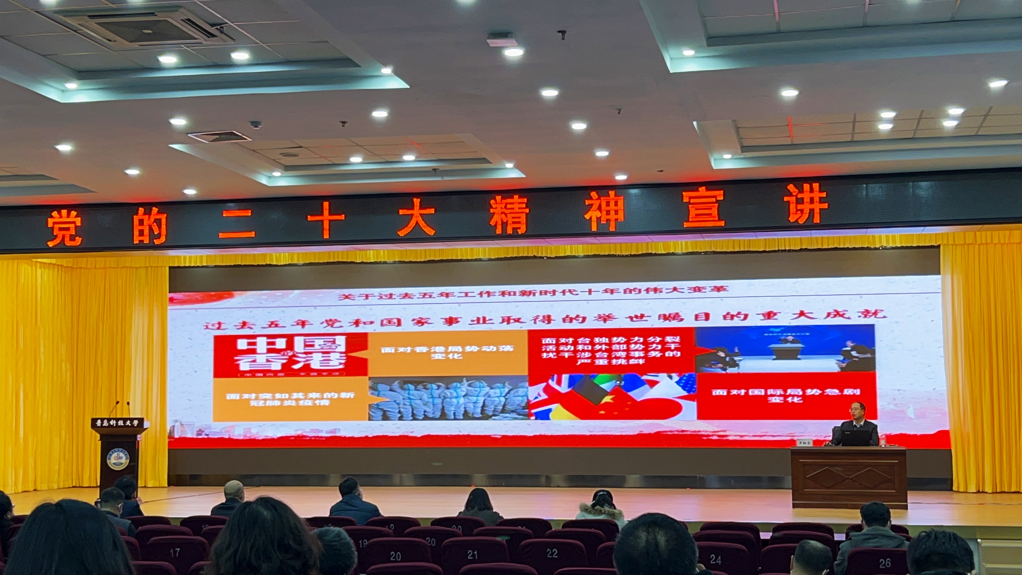 为深入学习宣传贯彻党的二十大精神,根据学校党委工作安排,11月29日下午,党委常委、副校长罗细亮在崂山校区第二报告厅为联系单位讲授党的二十大精神专题党课。环境学院党政领导、党支部书记作为联系单位代表参加党课。