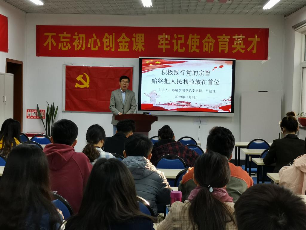 为深入推进学校党委“不忘初心、牢记使命”主题教育工作安排,近日,环境学院党总支书记吕德谦在学院楼3015会议室讲授了题为《积极践行党的宗旨,始终把人民利益放在首位》的主题教育专题党课。研究生党支部和本科学生党支部全体学生党员参加了党课学习。