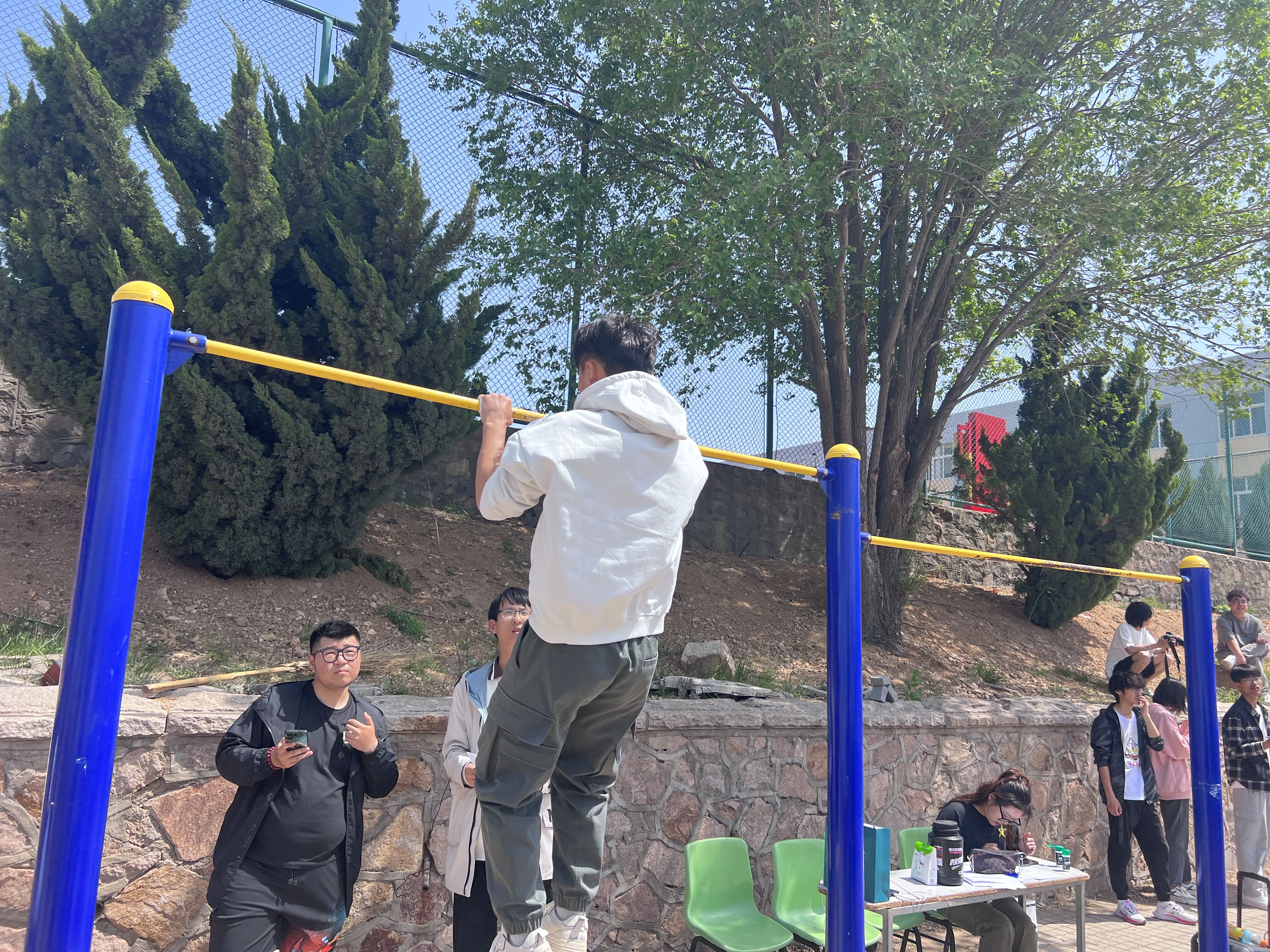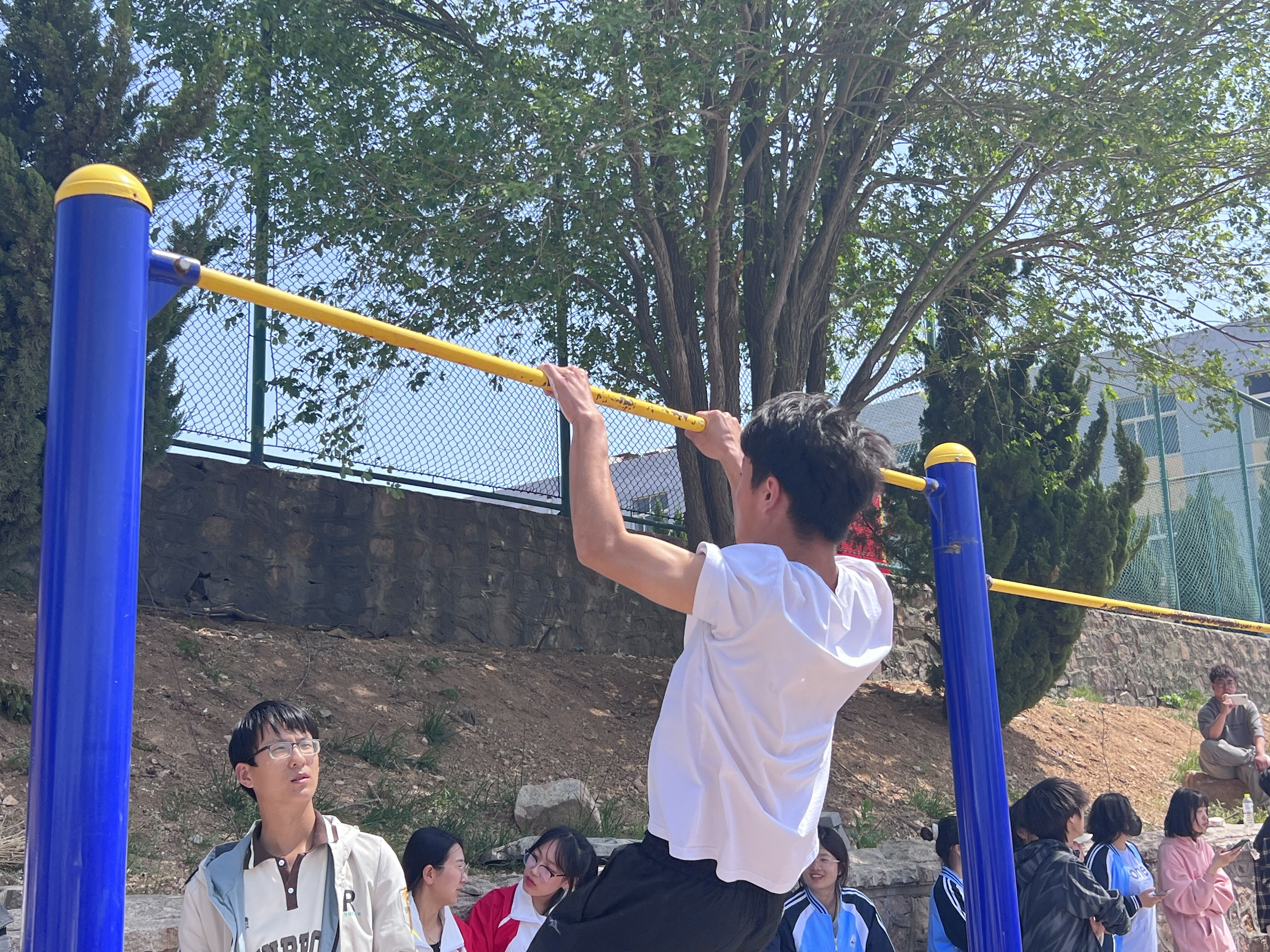赛场上,参赛同学们将汗水撒在单杠上,他们用充满力量的手臂带动着身体,一次次双手力量的爆发,咬紧的牙关,是他们不服输的气性,标准的动作,是他们不怕苦的精神。