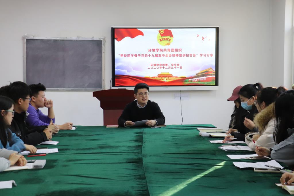 12月30日,学校团学骨干党的十九届五中全会精神宣讲报告会在崂山校区第二报告厅举行,党委书记马连湘作了《学习全会精神 融入学校大局 廓清成长路径》主题辅导报告,学院团委书记钟硕现场聆听了报告会,学院学生会和研究生会学生骨干、团支书和班长代表、学生代表等60余名青年学生在学院楼3015会议室通过观看直播的方式线上参加了报告会。