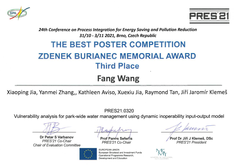 环境学院贾小平老师作为会议国际科学委员会(ISC)委员,与中德工程学院王芳老师,以及研究生张燕美、周陶美子在线上参加了该次会议,共发表论文两篇,其中张燕美同学的论文“Vulnerability Analysis for Park-Wide Water Management Using Dynamic Inoperability Input-Output Model”经过评委组严格评审,荣获最佳墙报奖第三名。该论文第一作者和通讯作者所在单位均为英国威廉集团。该论文长文被推荐到Journal of Cleaner Production (IF=9.297)发表。同时该论文也是与菲律宾德拉萨大学副校长Raymond Tan 院士在过程集成领域长期合作的成果之一。该工作得到了国家重点研发计划战略性国际科技创新合作重点专项和国家自然科学基金面上项目的资助。