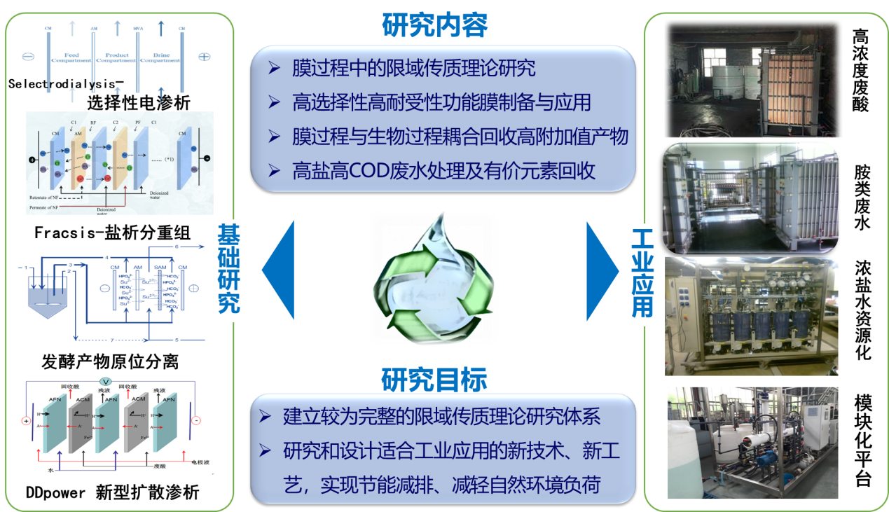 团队围绕膜分离传质机制与工艺优化、功能膜材料设计与制备、三废资源化技术开发、膜技术集成与工程放大等方向开展研究,重点在高盐高有机物废水近零排放技术、海(卤)水膜法资源化技术、工业废盐(废酸)析分与资源化技术、战略性关键金属回收技术、工业废水微生物处理与资源化技术等领域进行攻关。
