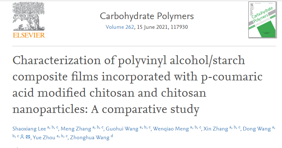 近日,环境学院李少香教授团队在前期研究工作的基础上开发了多种壳聚糖基抗菌、抗氧化材料并构建了相应的具有生物相容性食品包装膜,相关成果以“Characterization of polyvinyl alcohol/starch composite films incorporatedwith p-coumaric acid modified chitosan and chitosan nanoparticles: A comparative study”为题发表在国际知名期刊Carbohydrate Polymers(中科院一区TOP期刊,IF=7.182)上。
