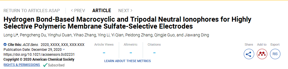 近日,环境学院青年教师李龙博士团队及钱翌教授团队在前期研究工作的基础上(Analytical Chemistry, 2020, 92(21): 14740-14746;ACS Sensors, 2020, 5(11):3465-3473;Sensors and Actuators B: Chemical,2020,129151),开发了新型硫酸根载体并构建了高选择性硫酸根聚合物膜电极,相关成果以“Hydrogen Bond-Based Macrocyclic and Tripodal Neutral Ionophores for Highly Selective Polymeric Membrane Sulfate-Selective Electrodes”为题发表在国际经典期刊ACS Sensors(一区TOP期刊,IF=7.33)上。