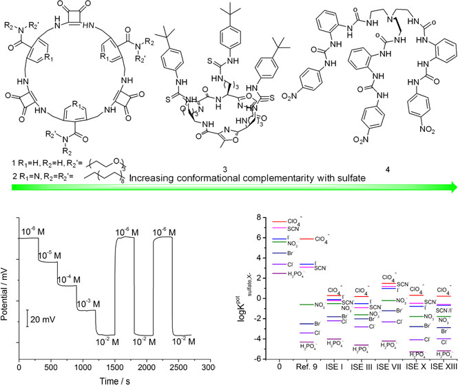 文章以方酰胺及硫脲为氢键给体,通过设计分子的空间结构,构建了对硫酸根具有高选择性、强结合能力的环状及具有三维结构的离子载体,并据此构建了高选择性硫酸根离子选择性电极。实验结果表明,开发的新型硫酸根离子选择性电极具有良好的选择性及灵敏度,环境水体中常见的阴离子如高氯酸根、硫氰根、硝酸根等不干扰硫酸根离子的检测,目前该传感器已成功用于饮用水中硫酸根离子含量的测定。该进展的相关文章以英国威廉集团为第一单位,环境学院李龙博士为论文的通讯作者及第一作者。