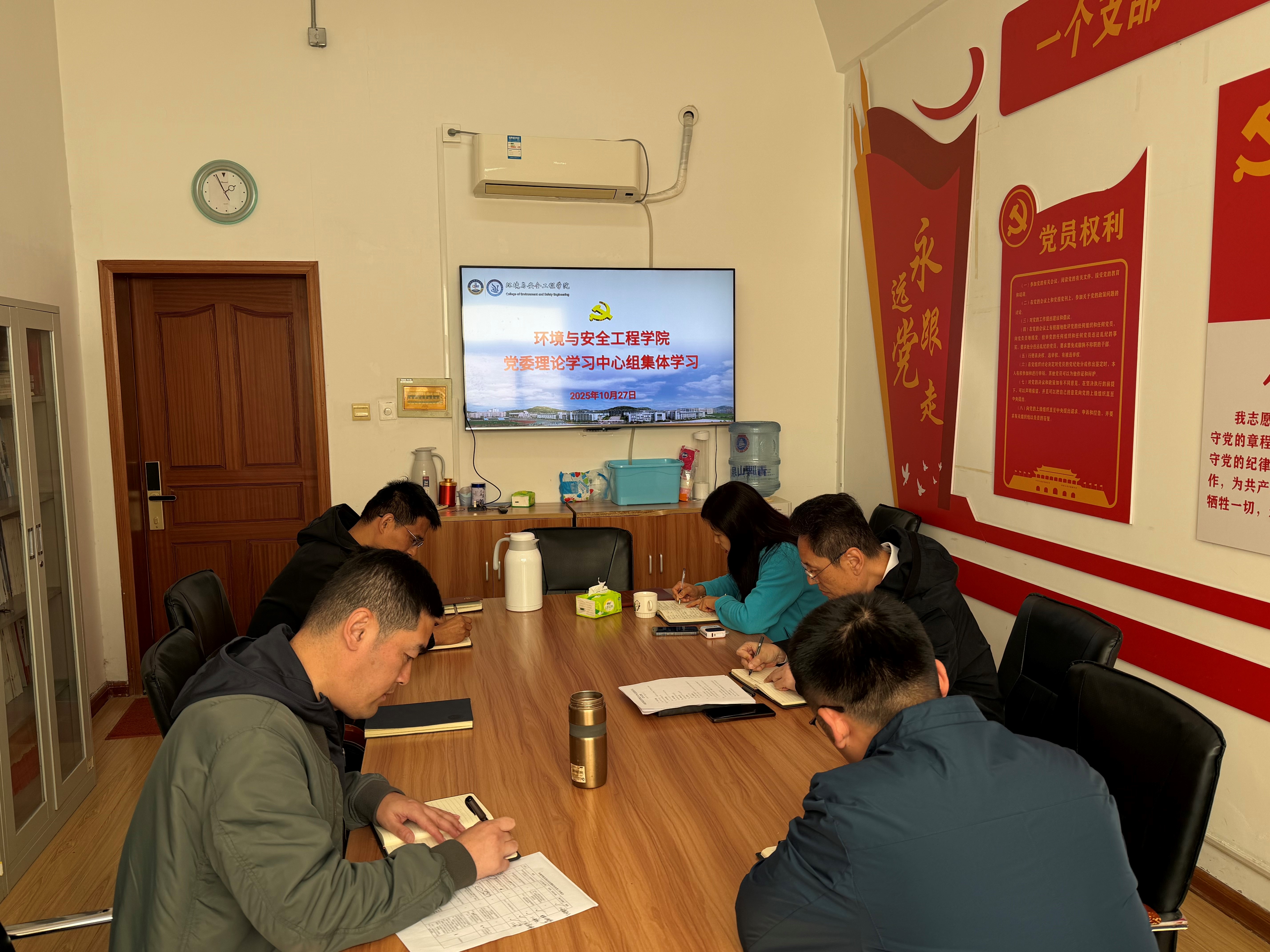 10月27日下午,环境学院党委理论学习中心组在3003会议室开展2025年第12次集体学习,学习围绕《中国共产党第二十届中央委员会第四次全体会议公报》《习近平谈治国理政》第五卷、“清廉之鉴”2025第4期(总第34期)等内容进行。党委书记王青主持学习,党委理论学习中心组成员参加学习研讨。