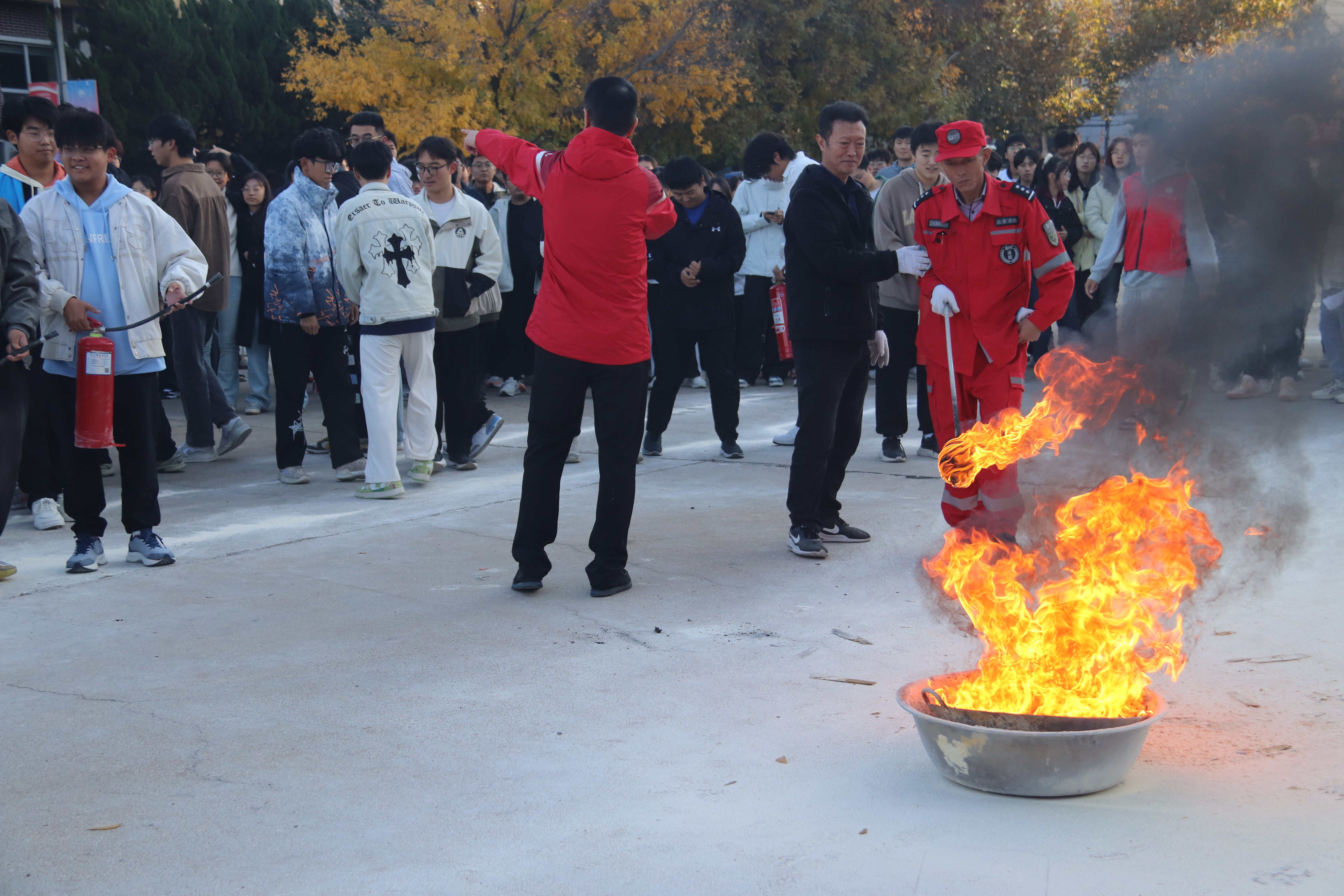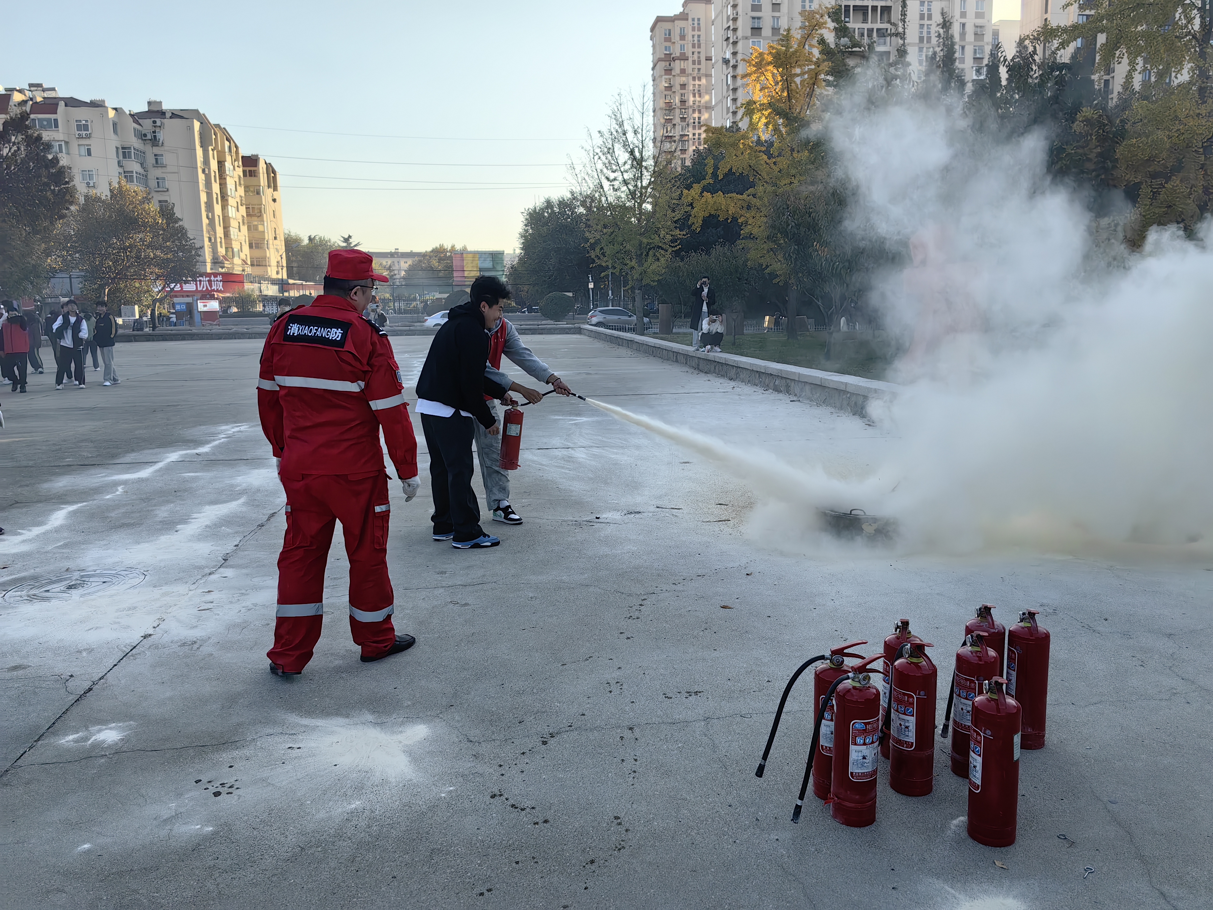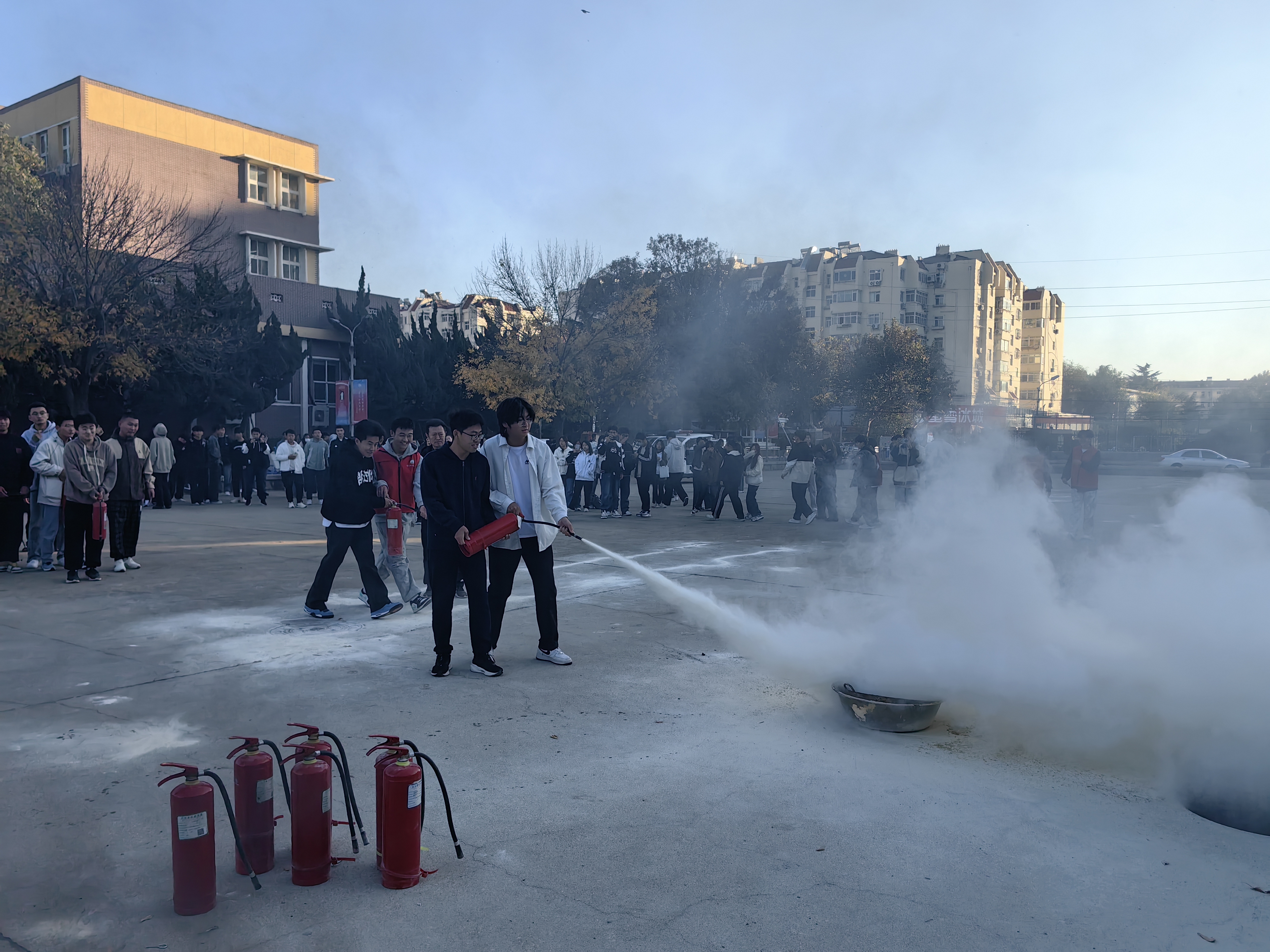 消防应急疏散演练结束后,仇立峰强调了安全意识的重要性,讲解了消防安全“四个能力”及知识要点,演示了灭火器的正确使用方法。同学们在指导下分组进行灭火实操演练,亲身体验灭火器的正确使用步骤,掌握基本灭火技能,切实增强防火灭火实践能力。