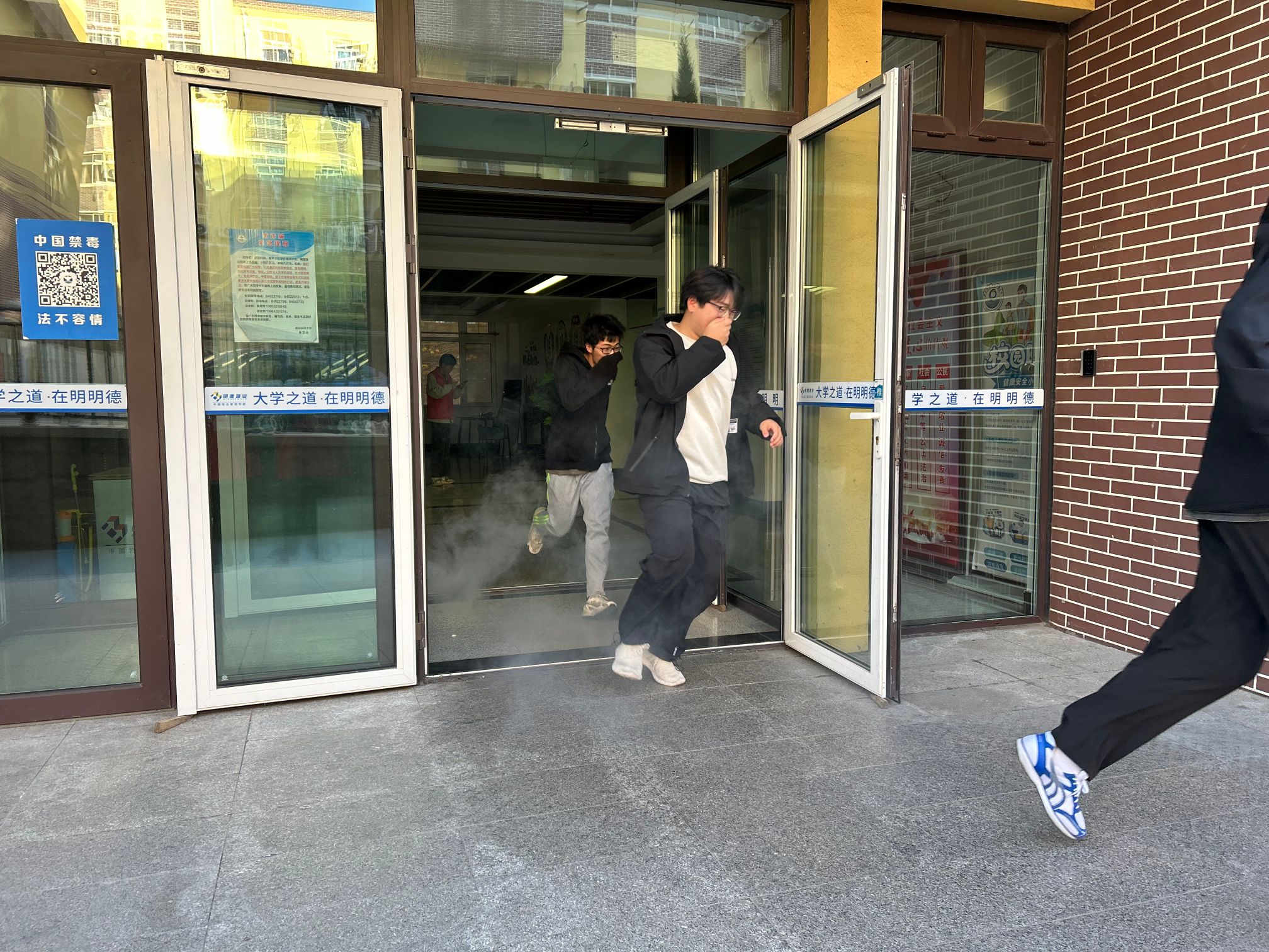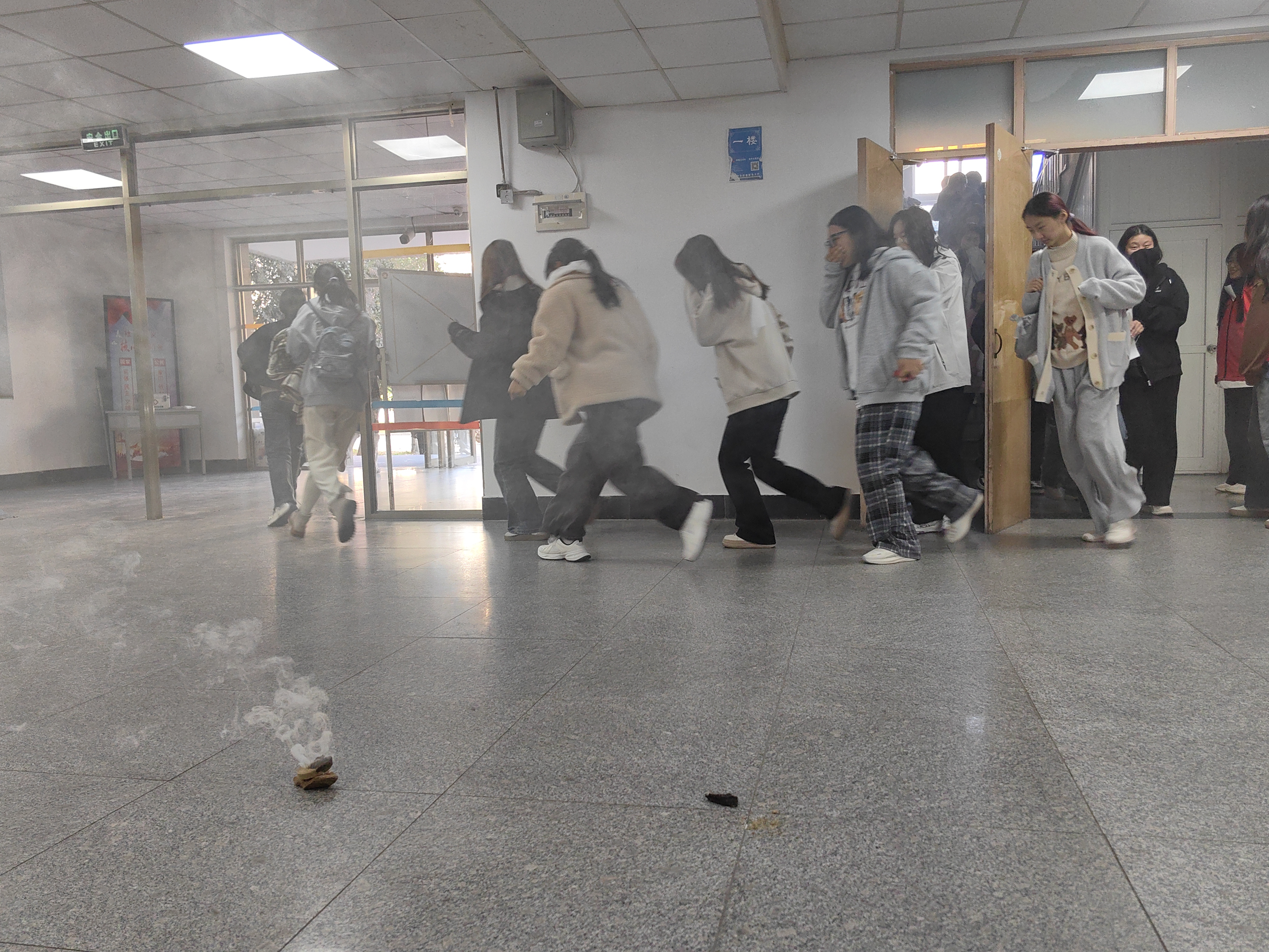 随着警报声响起,疏散演练正式开始,两学院工作人员迅速到达疏散通道口,引导学生有序撤离。学生们捂住口鼻,低头弯腰,迅速逃离模拟火灾现场,并在小五四广场集合,各班班长清点人数,确保所有学生安全撤离。