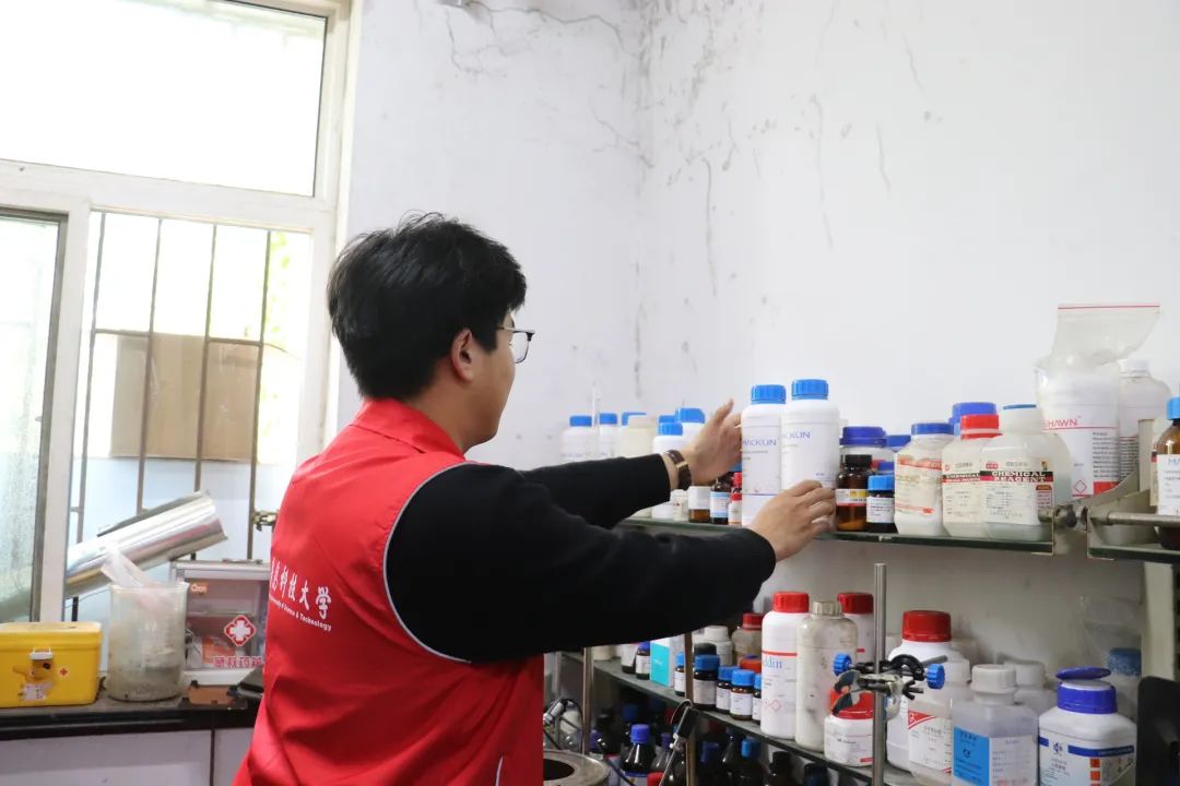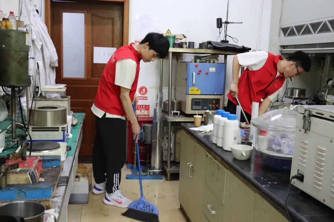 为做好“五一”假期实验室安全卫生工作,确保节日期间实验室安全,学院提前谋划、积极部署,充分发挥学院实验室安全巡查“党员先锋岗”模范带头作用,进行实验室安全排查与卫生清理工作。过程中,同学们将各类化学试剂分类整理,检查实验室插排、灭火器材等是否完好,并对实验桌、地面等脏污处进行了细致清扫,多举措筑牢实验室安全卫生屏障。