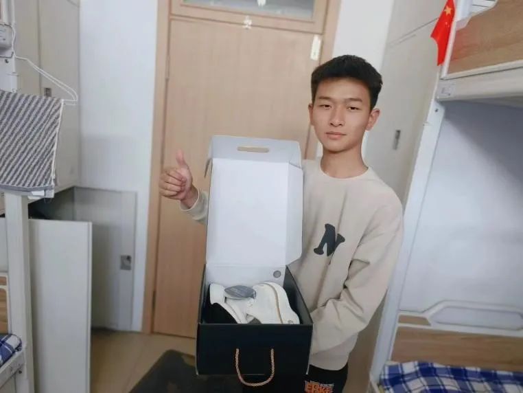 当我拿到鞋子时,还未拆开我就从它的鞋盒上看到了满满的心意。因为迫不及待地想和家人分享,还给家人上演了一场开箱秀,在展示时,他们纷纷表示这双鞋子的外观和质感都很不错。这双鞋子是学校和国橡中心给我们的礼物,也是对我们在未来生活中不断奔跑,追逐属于自己的舞台的一种激励!