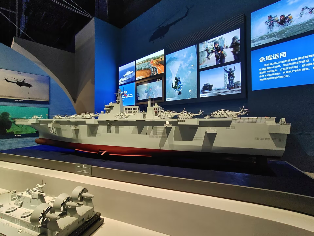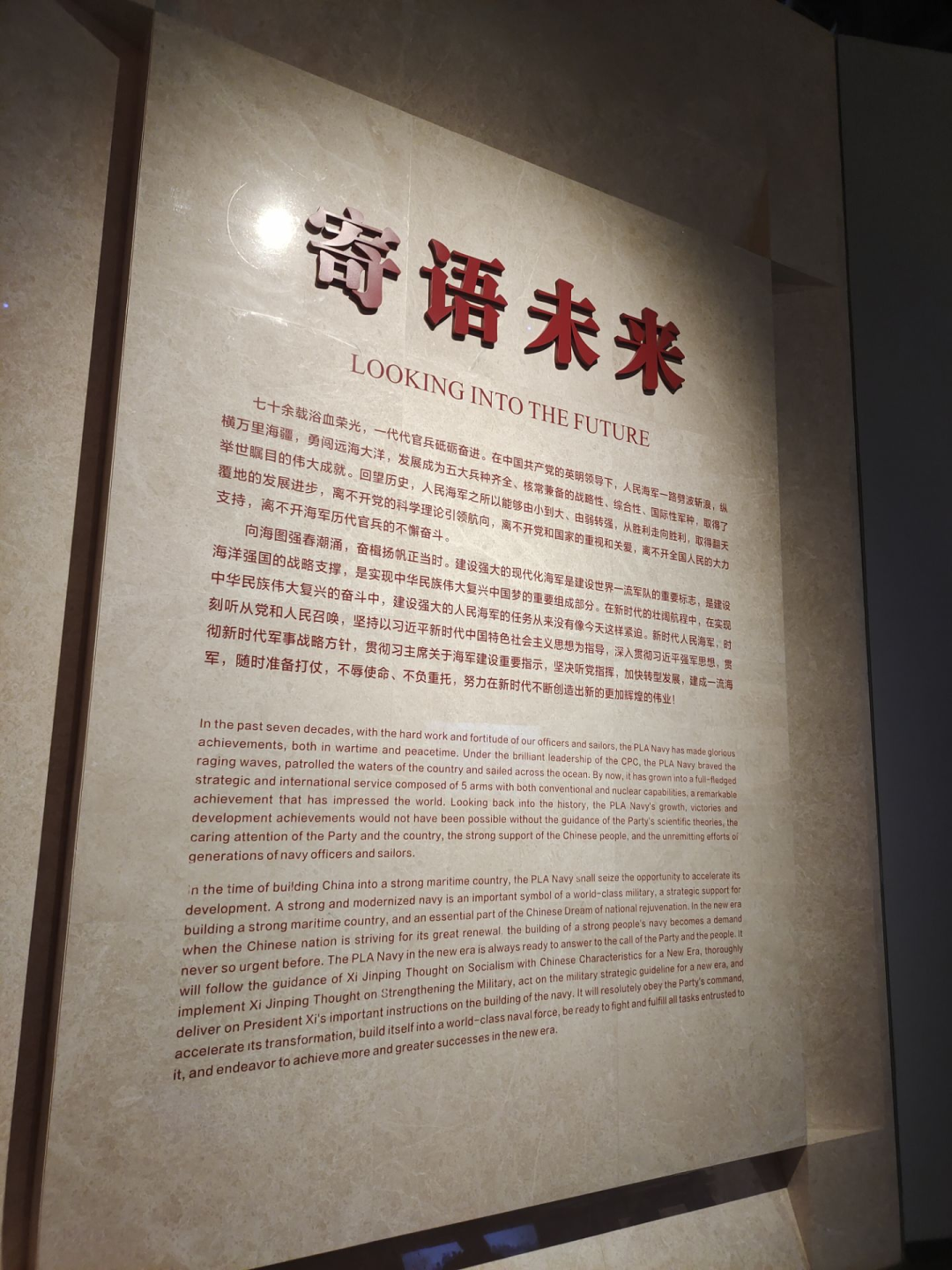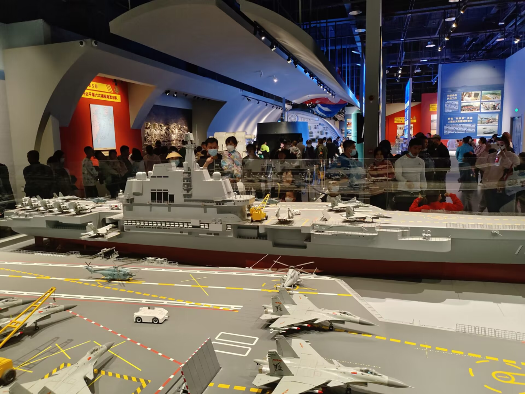 中国海军博物馆占地四万多平方米,包括室内展厅、海战史展室、武器装备展区、海上展舰区。馆藏的数千件珍贵文物,从不同侧面反映了中国人民海军从无到有、不断壮大的历程,同时在此展出的六十多个国家军队赠送给我国海军的珍贵礼品,彰显了我国和他国之间的友好情谊。