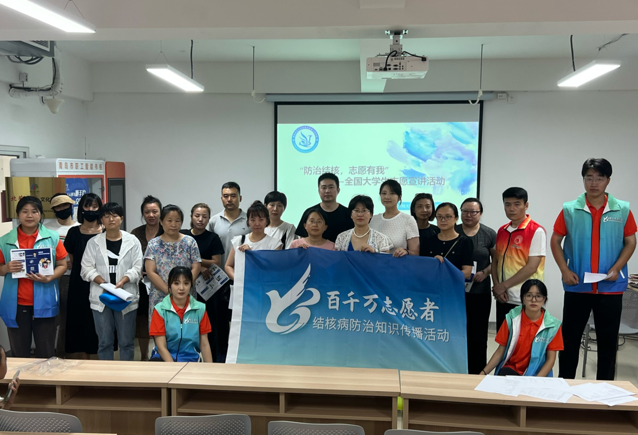 志愿服务进社区。8月底前,团队成员前往青岛市市北区双山街道蚌埠路社区开展防治结核宣讲活动。宣讲过程中,团队成员以知识手册为材料支撑,通过集中宣讲和走访宣传的形式,向社区居民讲解了结核病的主要症状、传播途径、易感人群、防治知识等,在倡导居民讲究个人卫生习惯的同时,也将防治结核的自我预防措施以及结核病治疗有关政策向大家做了详细介绍,让社区居民对结核病防治有了进一步的了解。