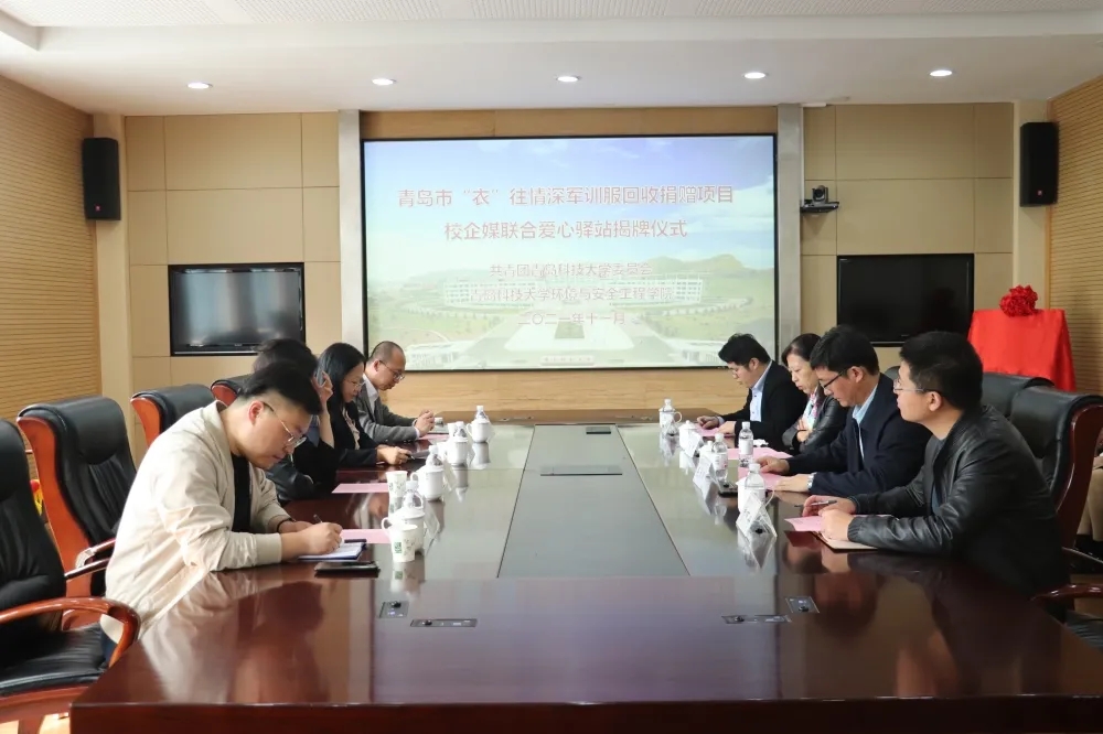 10月3日,全省首个大学生军训服回收捐赠项目——“校企媒联合爱心驿站”在学校四方校区1号行政楼第一会议室揭牌。共青团青岛市委志工部部长李耀贤,中建三局一公司青岛公司工会主席赵新华,“衣”往情深公益活动发起人之一、半岛都市报资深记者徐杰,校团委书记毛常明,环境学院党总支书记王青出席揭牌仪式。