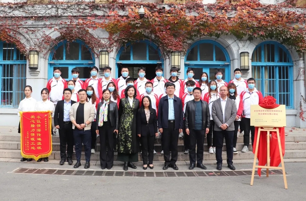李耀贤和王青共同为“校企媒联合爱心驿站”揭牌,赵新华代表企业向学校赠送“衣往情深传递温暖、爱心接力情暖工地”的锦旗。