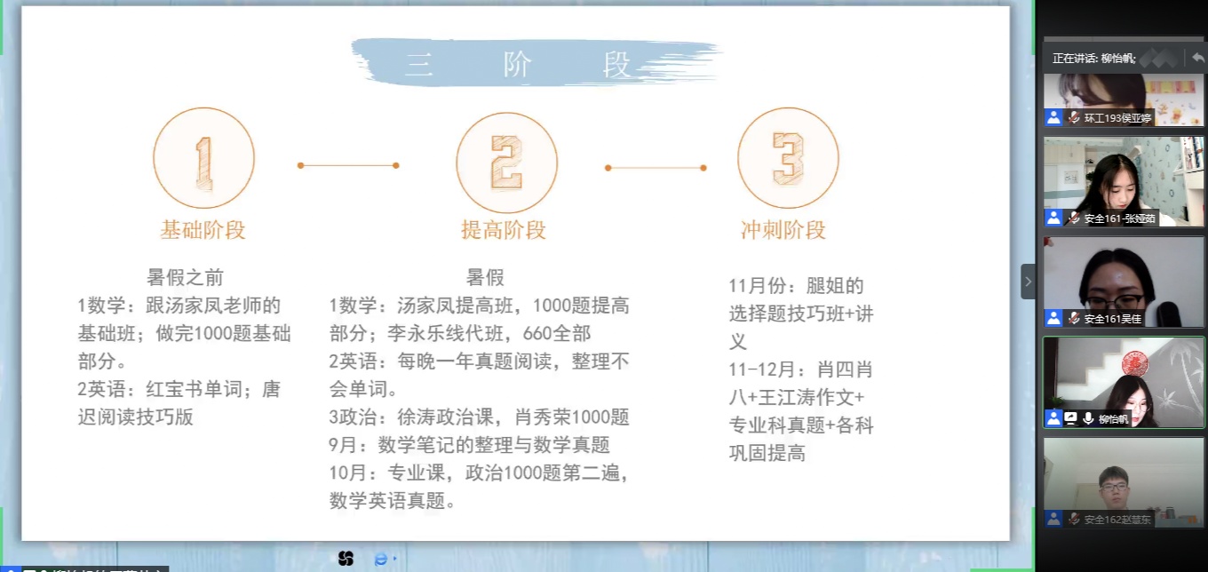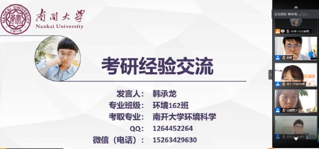 为帮助即将考研的大三同学确定考研方向,了解考研相关信息,营造良好的考研氛围,充分备战2021年考研,6月12日,环境学院举行线上考研经验分享交流会。环境学院2017级辅导员钟硕老师、于杰老师以及2016级考研优秀学生代表出席交流会,2017级全体学生参加了此次交流会。