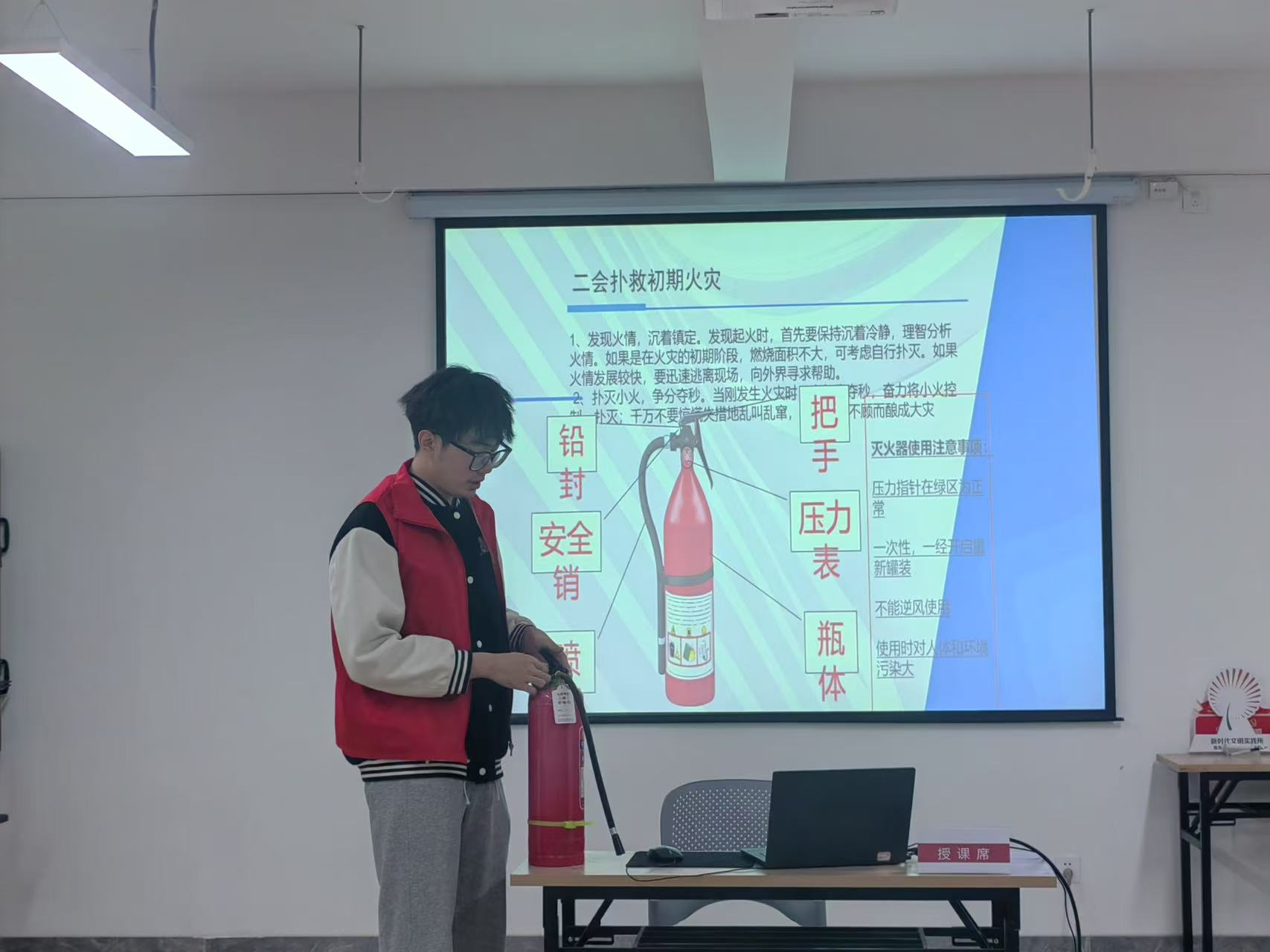 活动现场,团支部结合前期调研中发现的社区安全隐患,围绕《社区安全生产巡查实务》专题展开系统讲解。主讲人刘召鹏从“安全与事故的定义”切入,通过漫画案例解析、消防器材实操演示、电气隐患排查要点剖析等模块,重点针对社区常见的消防通道堵塞、用电设备老化、微型场所消防管理等痛点问题提出专业建议。