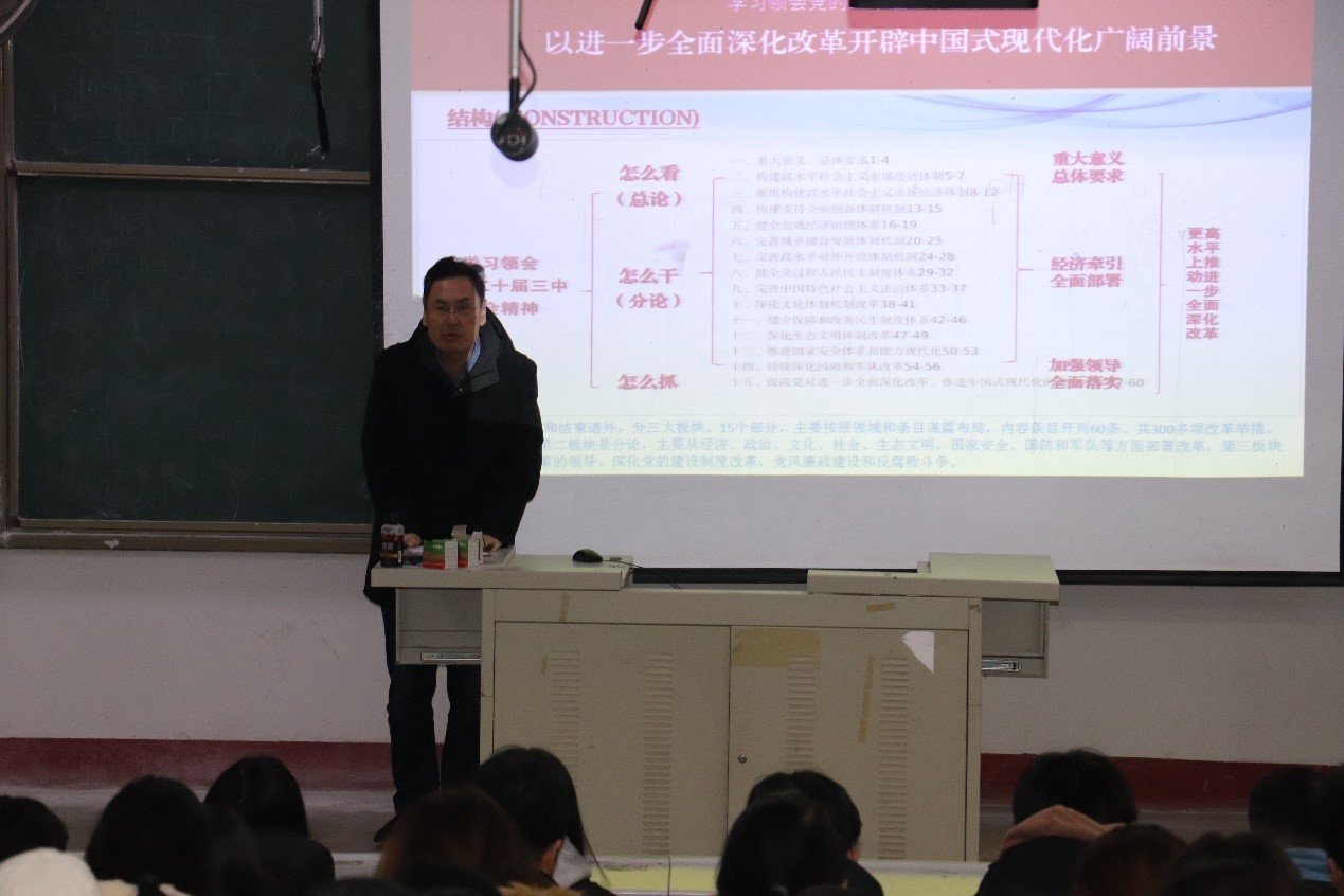 田文德围绕进一步全面深化改革的重大意义和总体要求、聚焦重点在更高水平上进一步全面深化改革、提高党对进一步全面深化改革的领导水平三个方面进行宣讲,将全面深化改革的总体要求和当下社会问题与学员所学专业结合起来,借助丰富生动案例,引导同学们深入准确领会把握党的二十届三中全会精神,立足实际推动学校改革发展。