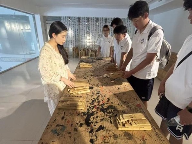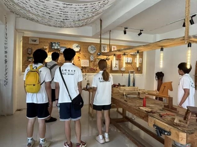 实践团成员走进曲阜鲁班工坊,探寻鲁文化中“工匠精神”的传承与发展。工坊内,榫卯结构模型、传统农具复刻品、木雕工艺品等陈列有序,负责人向团队详细介绍鲁班文化的历史渊源,解读“精益求精、敢为人先”的鲁班精神如何与儒家“务实致用”思想相融,成为鲁文化的重要精神内核。同时,团队成员分组参与榫卯小板凳制作实践,在师傅的指导下,从测量、切割到拼接,体验每一个工艺环节。